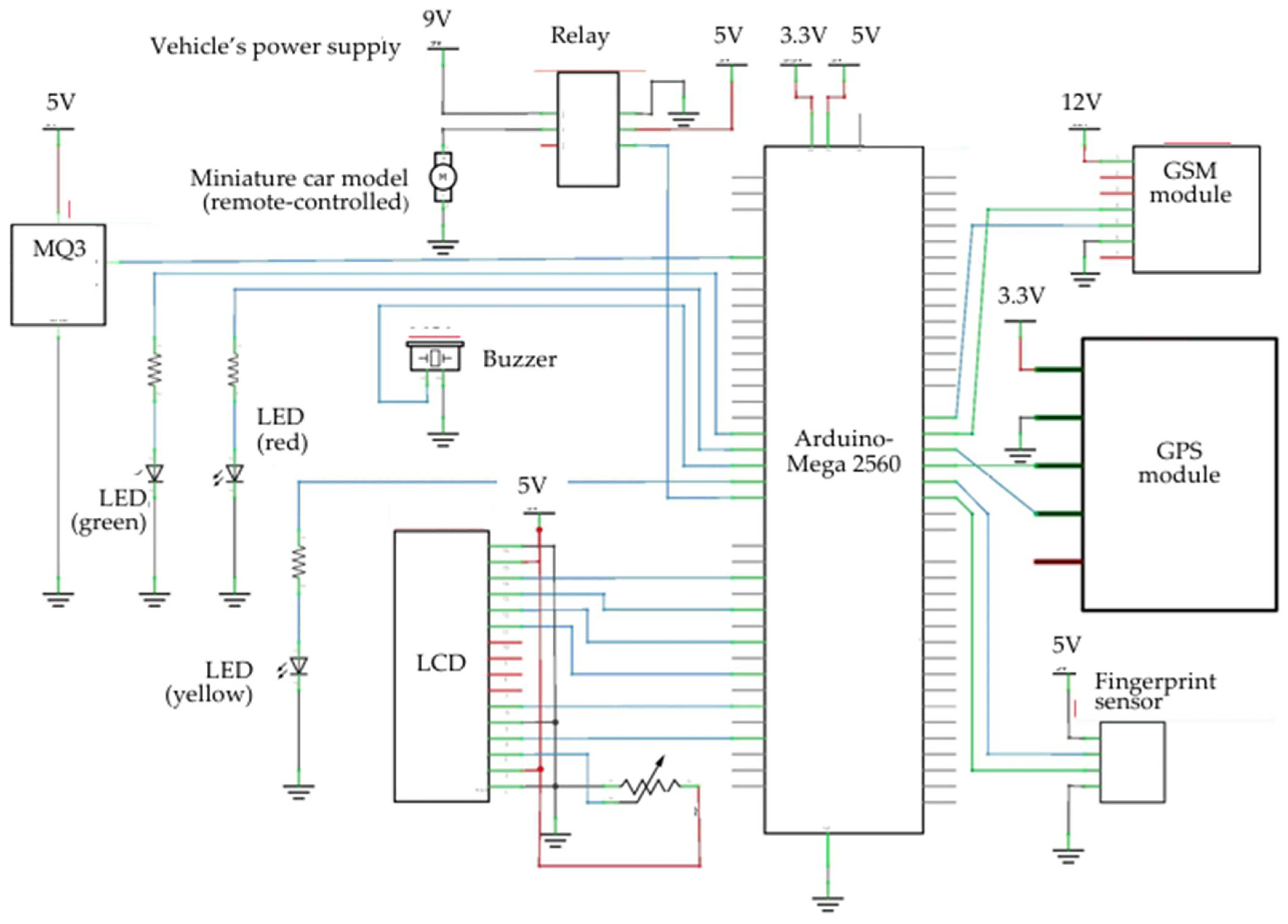 | Relay (5 V) | It immobilizes the vehicle in case alcohol above the permissible limit is detected. |
