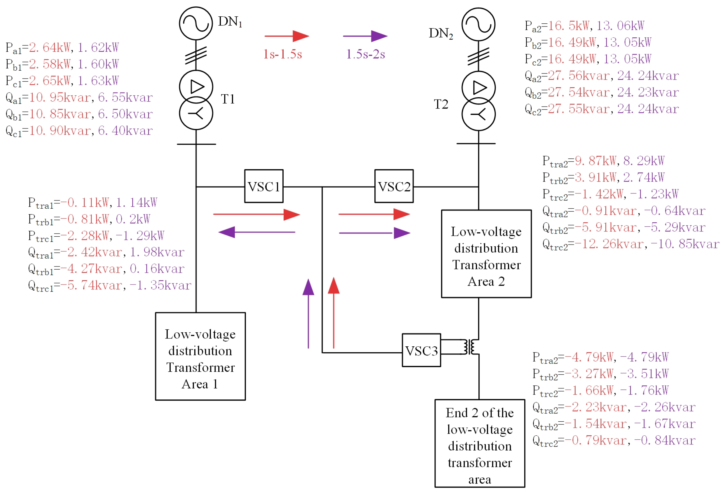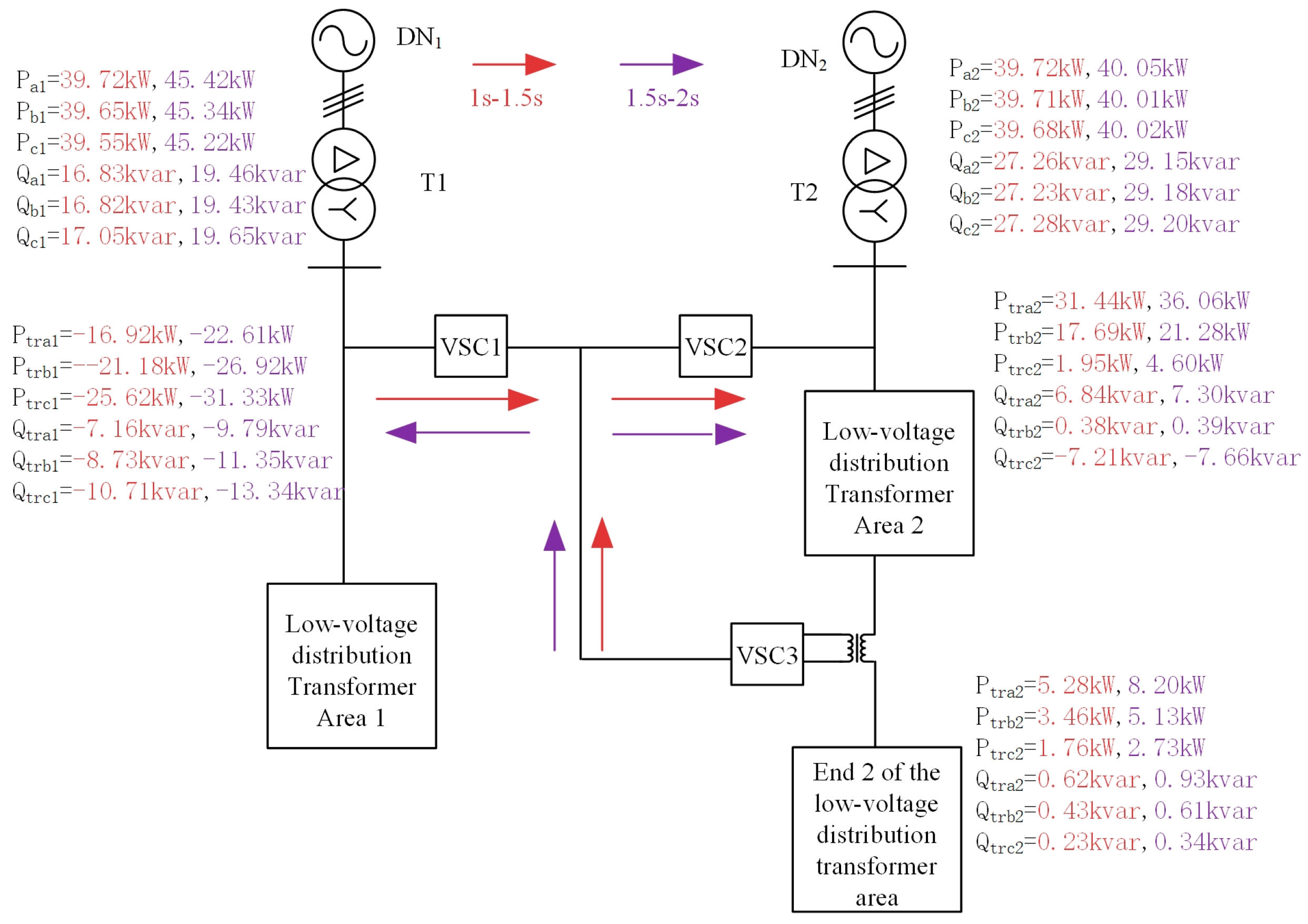 - VSC2, by absorbing power from the DC bus, compensates the power of each phase at the beginning of distribution area 2, thereby maintaining three-phase power balance at the beginning of distribution area 1. By adjusting its power optimization parameters, the direction of power flow between distribution areas can be modified.