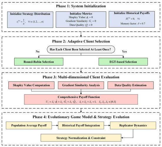 Under the EGT framework, replicator dynamics is a classical mechanism for strategy evolution. Its fundamental idea originates from the principle of survival of the fittest in evolutionary biology. Strategies associated with higher payoffs tend to expand within the population, whereas those with lower payoffs gradually diminish [15]. Unlike traditional game-theoretic models that rely on rational decision-making, replicator dynamics emphasizes local feedback-driven adaptation, enabling autonomous and continuous optimization without external supervision. In this study, the mechanism is employed to update clients’ participation probabilities, guiding the evolution of strategies toward system stability. The overall process is illustrated in Figure 4.