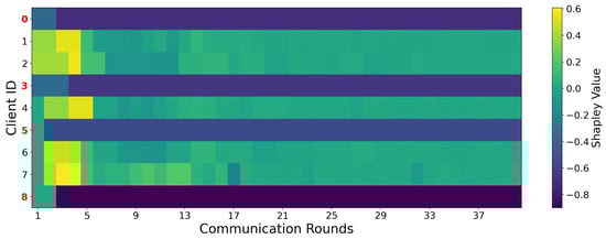 Let the set of all clients be , and let the utility function represent the performance gain of the global model when a subset of clients participates in validation. Client i’s Shapley value is given by: