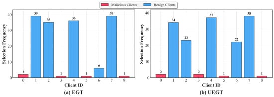 From a module-ablation perspective, UEGT can be regarded as an extended form of the standard EGT mechanism with the incorporation of uncertainty-guided strategies. Accordingly, this section conducts a comparative analysis between the standard EGT and UEGT mechanisms in terms of detection performance and strategic behavior during the training process, with a particular focus on differences in model performance and client scheduling strategies. As shown in Table 4, under identical conditions of communication rounds, attack ratio, and model architecture, UEGT outperforms EGT across all performance metrics. Specifically, the average accuracy improves from 89.01% to 89.07%, while the average F1-score increases from 88.56% to 89.02%, demonstrating that UEGT achieves superior overall robustness and detection capability. It is noteworthy that UEGT’s performance improvement is not primarily due to enhanced malicious client identification. As illustrated in Figure 9, the cumulative selection counts of the four malicious clients (Clients 0, 3, 5, and 8) are nearly identical under both mechanisms, with five selections under EGT and six selections under UEGT, and only a minor discrepancy for Client 3. This indicates that both mechanisms exhibit comparable effectiveness in suppressing adversarial behaviors, and the exploratory component introduced by UEGT does not compromise its defense capability.