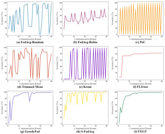 To further compare the dynamic performance evolution of different client selection strategies during the communication process, Figure 10 illustrates the accuracy trends of all methods over 40 communication rounds. As observed in the figure, the proposed UEGT mechanism exhibits the fastest convergence rate and superior stability. During the first fifteen communication rounds, its accuracy rapidly increases and stabilizes, subsequently maintaining a consistently high level above 98% with minimal fluctuations. This indicates that the uncertainty-guided strategy evolution mechanism designed in UEGT not only effectively filters out malicious clients but also ensures the stable participation of high-quality nodes, thereby significantly enhancing both the overall performance and robustness of the federated model.