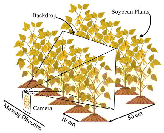 This study employed a Xiaomi 13 smartphone to capture individual soybean plants using a m × m white background panel as an isolation screen. This setup effectively isolated adjacent crop rows in dense field environments, thereby reducing background homogeneity interference and enhancing target-plant separability. All images were collected during the maturity stage (late September) under overcast, drizzly, and sunny conditions and across early-morning, midday, and late-afternoon light periods to enhance the model’s robustness to illumination variability. During image acquisition, operators photographed plants from the side of the crop rows, positioning the background panel behind the target plants and adjusting the shooting distance to ensure complete plant coverage, as illustrated in Figure 1.