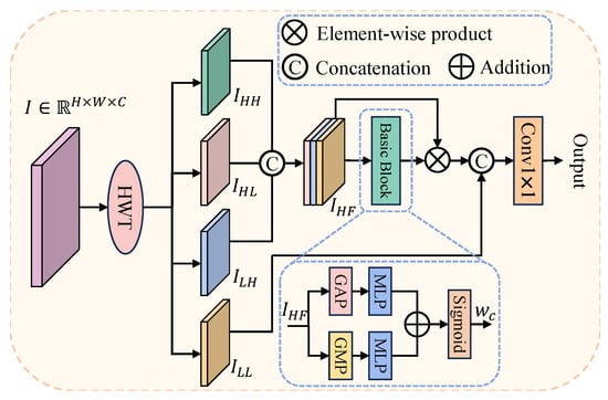 where denotes global average pooling, refers to a multi-layer perceptron with shared weights, and represents the sigmoid activation function. The weighted high-frequency features are then obtained via element-wise, channel-wise multiplication: