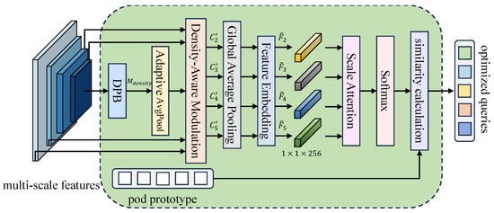 Finally, the similarity S is computed between the fused feature representation and the learnable pod prototype P, yielding the final query representation , which is enriched with both multi-scale characteristics and density-aware information:
