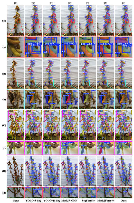 As shown in Figure 7, the performance of all comparison models deteriorates markedly in highly challenging real-world field scenarios. Mask R-CNN (Figure 7(4)) and SegFormer (Figure 7(5)) fail almost entirely, producing numerous misclassifications caused by complex background textures. Although YOLOv8-Seg (Figure 7(2)), YOLOv11-Seg (Figure 7(3)), and Mask2Former (Figure 7(6)) can identify some pod instances, they still generate substantial false positives, false negatives, and severe instance merging in homogeneous or densely clustered regions (Figure 7C,E,F).