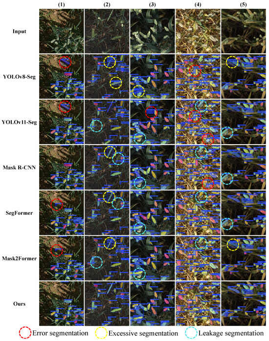 To visually illustrate the performance differences among models in the wheat-ear segmentation task, Figure 8 presents representative test samples along with the corresponding segmentation outputs of each method. The visual comparison reveals pronounced differences when handling occlusions and complex background textures. In regions obscured by leaves or containing complex background patterns (red dashed circles), YOLOv8-Seg and SegFormer exhibit noticeable false negatives. In regions affected by wheat-awn interference or densely clustered ears (yellow dashed circles), Mask R-CNN and YOLOv11-Seg frequently produce inaccurate boundaries or merge multiple instances. The baseline Mask2Former (cyan dashed circles) detects most wheat ears but still suffers from missed detections and boundary coalescence in high-density areas.