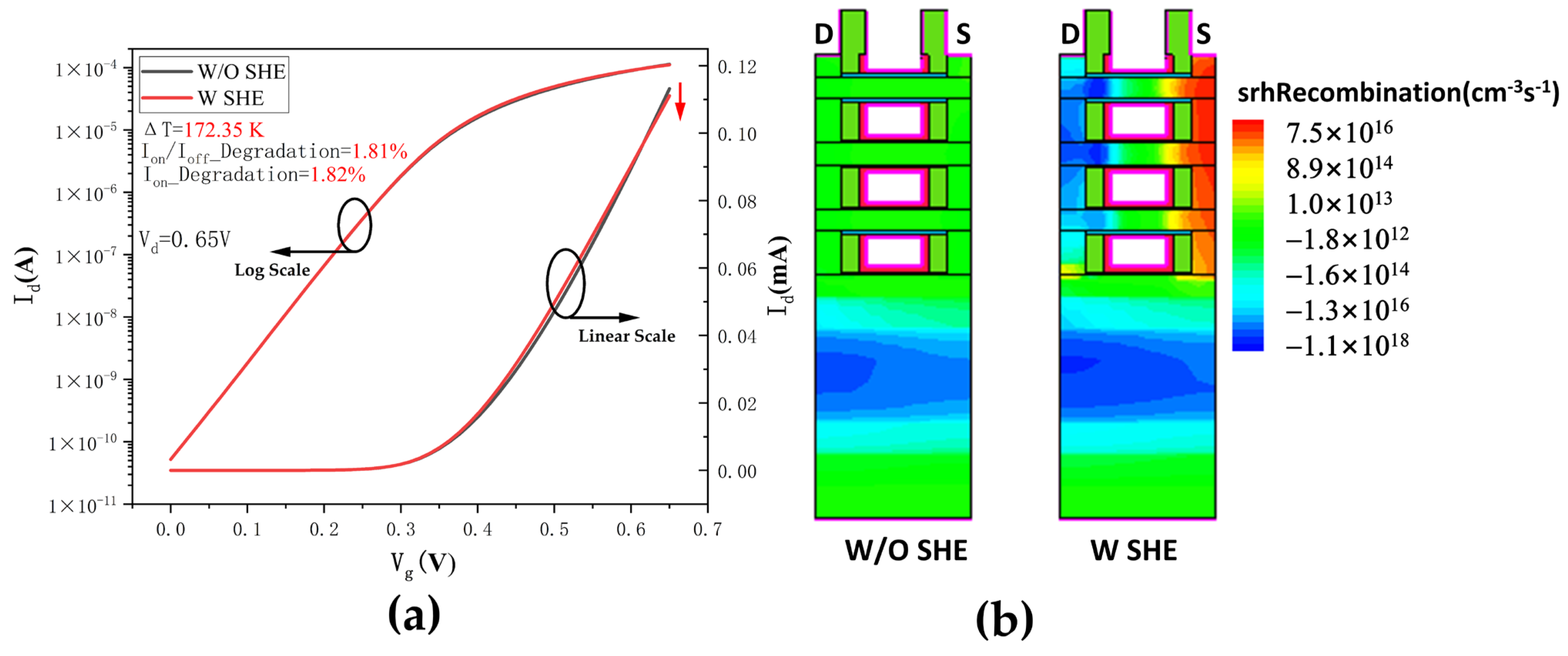 - Cai, L.; Chen, W.; Du, G.; Kang, J.; Zhang, X.; Liu, X. Investigation of Self-Heating Effect on Stacked Nanosheet GAA Transistors. In Proceedings of the 2018 International Symposium on VLSI Technology, Systems and Application (VLSI-TSA), Hsinchu, Taiwan, 16–19 April 2018; pp. 1–2. [Google Scholar]