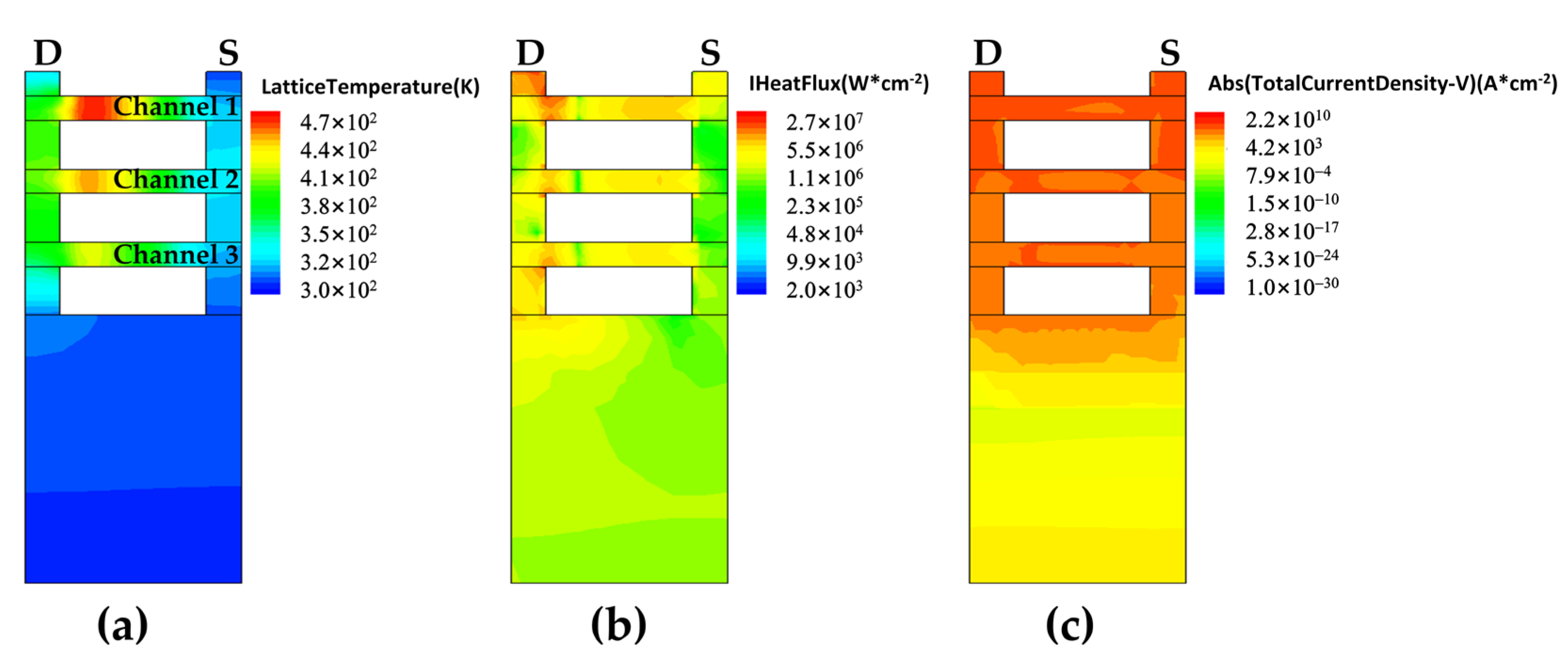 - Chalia, G.; Hegde, R.S. Study of Self-Heating Effects in Silicon Nano-Sheet Transistors. In Proceedings of the 2018 IEEE International Conference on Electron Devices and Solid State Circuits (EDSSC), Shenzhen, China, 6–8 June 2018; pp. 1–2. [Google Scholar]