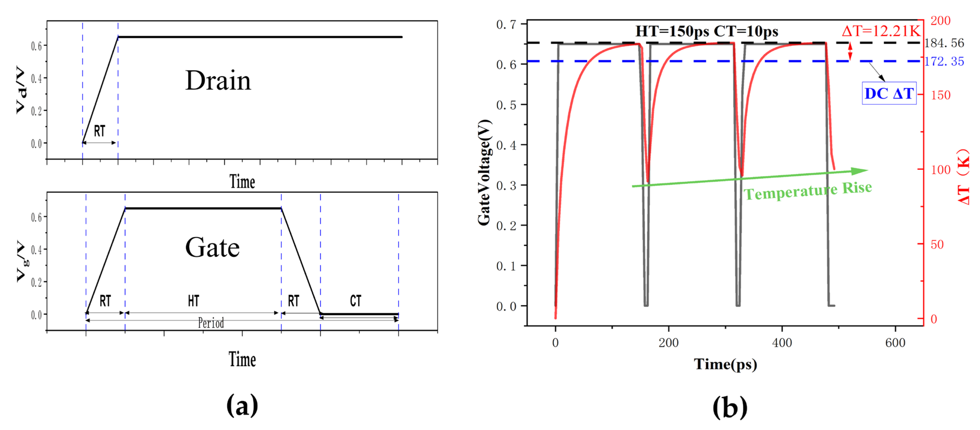 - Qu, Y.; Lin, X.; Li, J.; Cheng, R.; Yu, X.; Zheng, Z.; Lu, J.; Chen, B.; Zhao, Y. Ultra fast (<1 ns) electrical characterization of self-heating effect and its impact on hot carrier injection in 14nm FinFETs. In Proceedings of the 2017 IEEE International Electron Devices Meeting (IEDM), San Francisco, CA, USA, 2–6 December 2017. [Google Scholar]