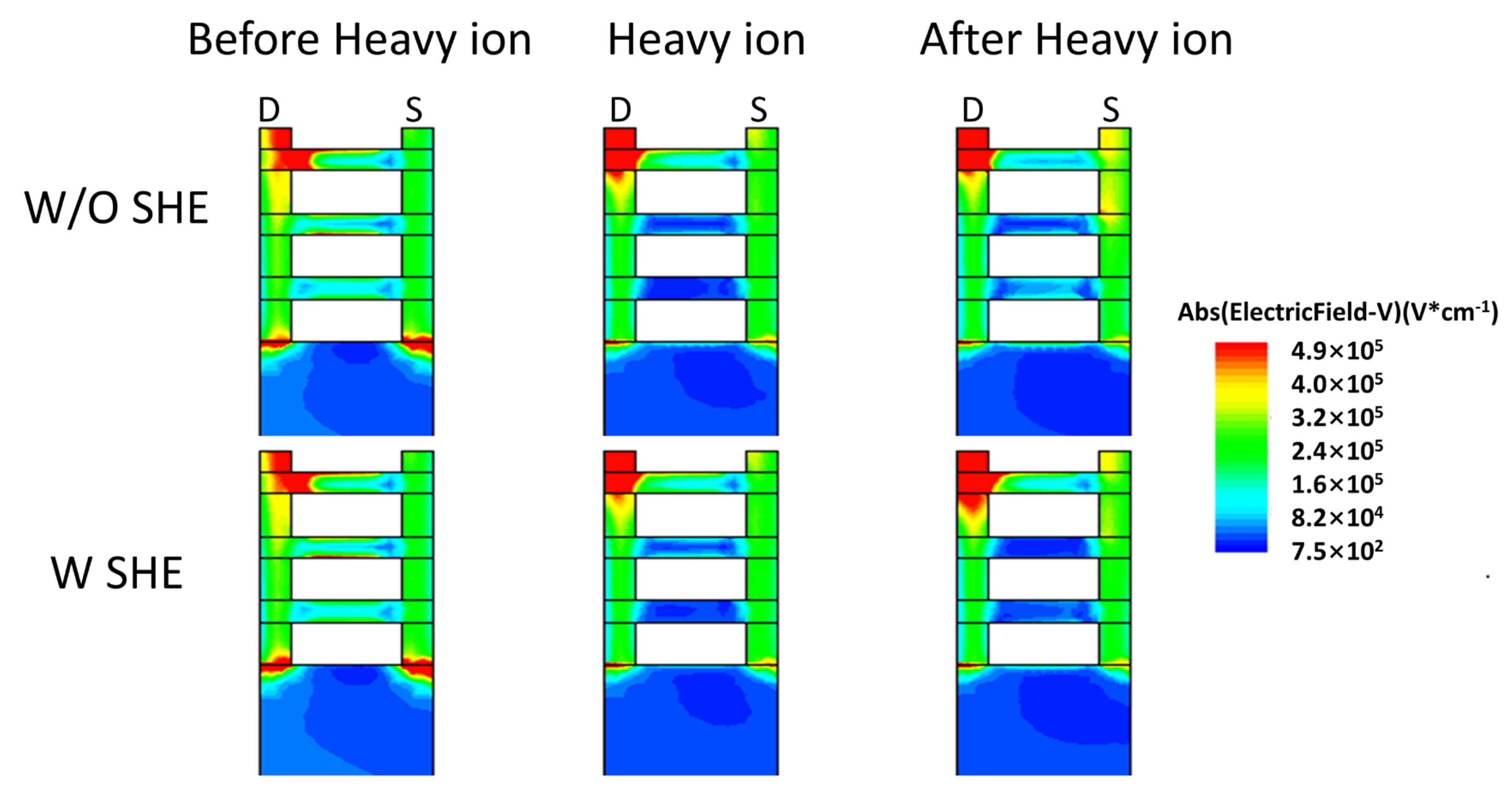 - Gong, Y.; Chen, X.; Zhao, Q.; Li, Z.; Li, Y.; Fan, J.; Hao, J.; Zhang, F.; Dong, Z. Study of electrical and thermal performance in single-event burnout of partial-SOI LDMOS transistors. Microelectron. Reliab. 2025, 169, 115736. [Google Scholar] [CrossRef]