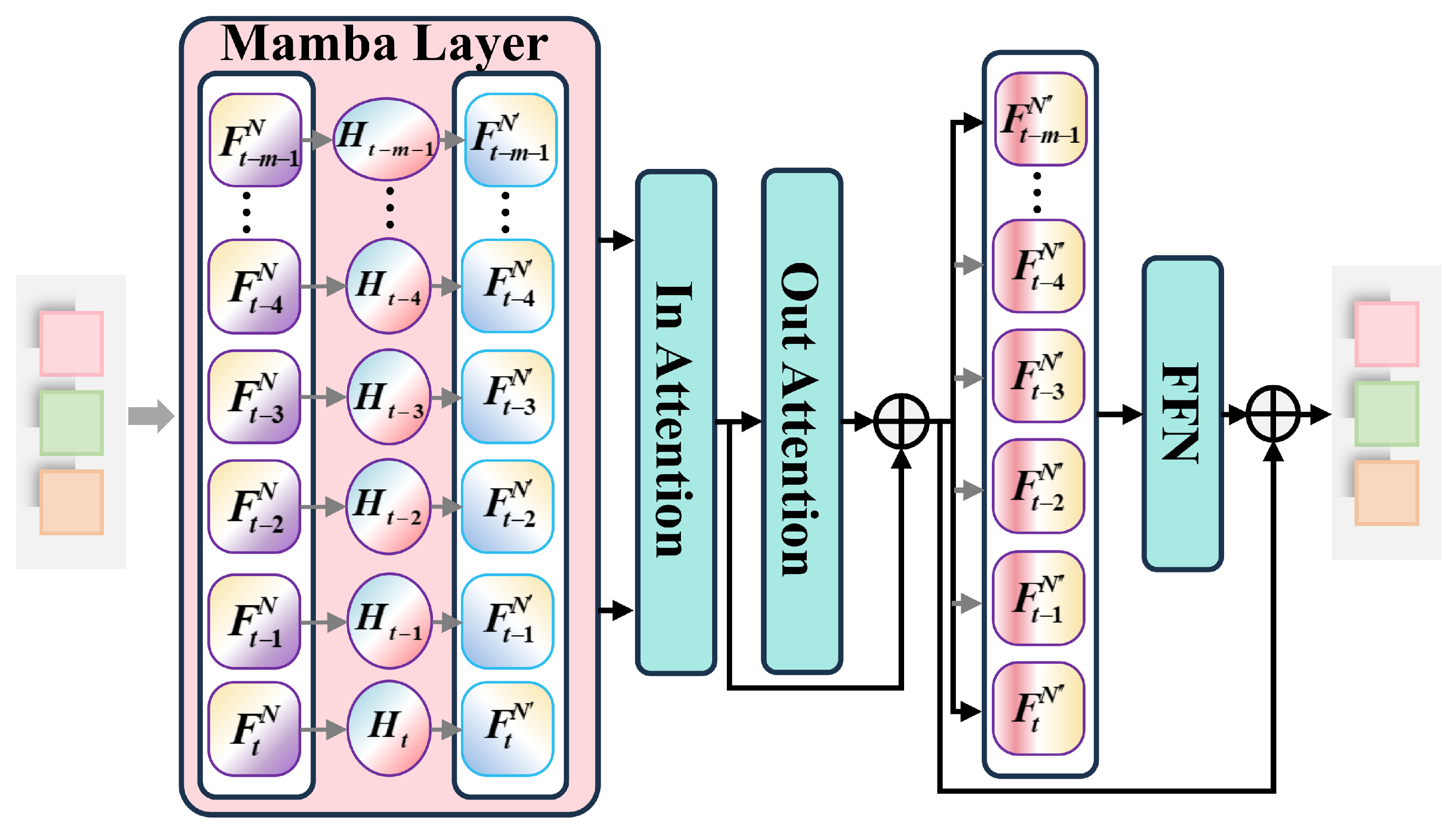 - Bidirectional Spatio-Temporal Mamba Module: It captures local spatial features of small targets through horizontal–vertical bidirectional scanning and models dynamic motion trends via forward–backward temporal scanning, achieving synergistic modeling of spatial details and temporal dynamics.