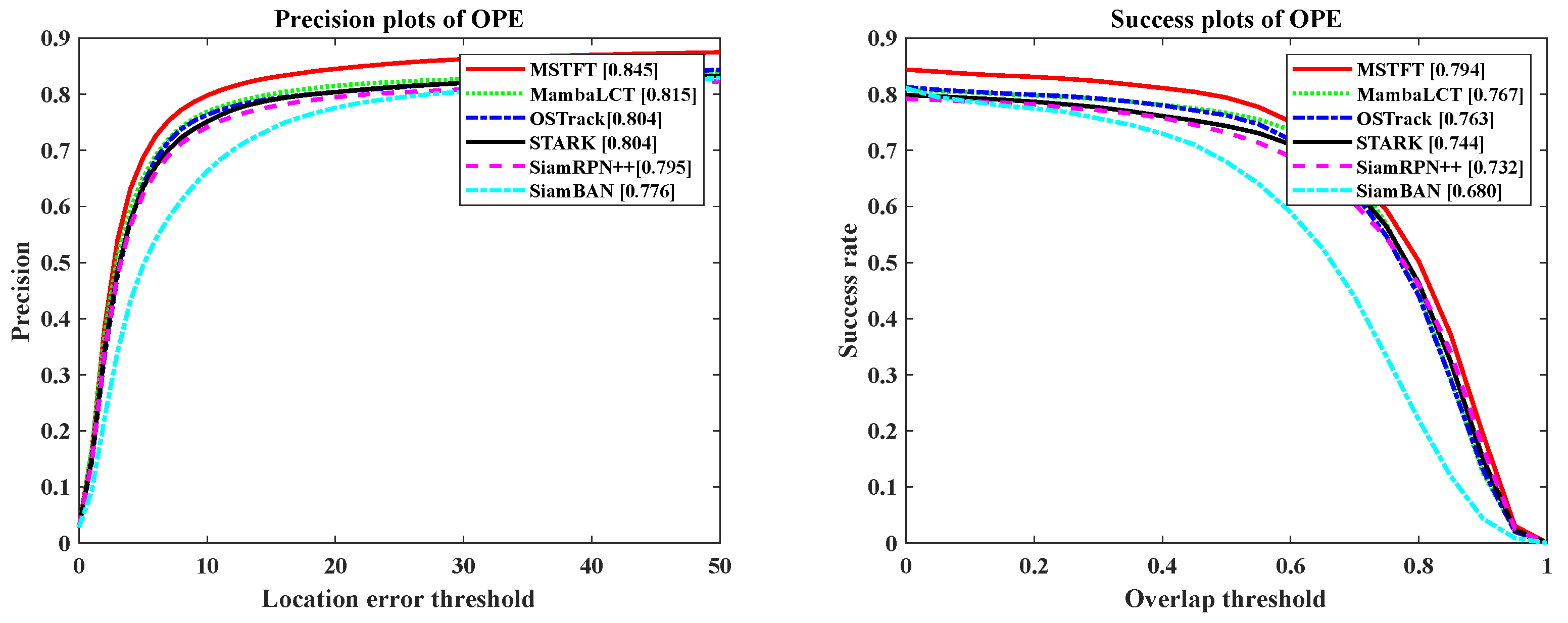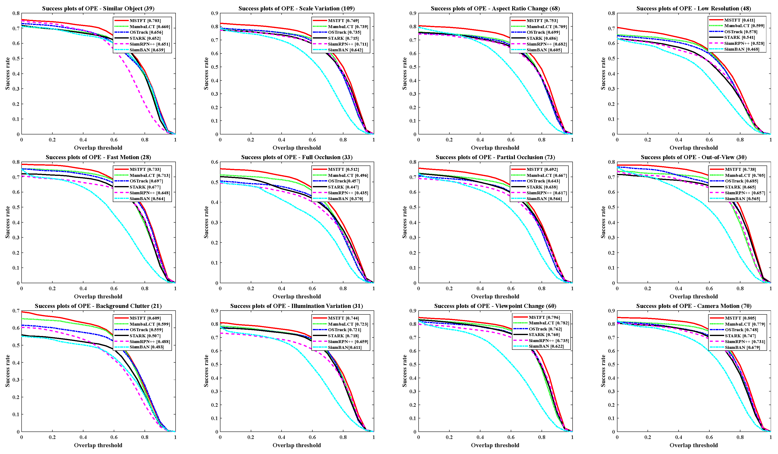 - Occlusion Robustness. In scenarios involving occlusion, MSTFT achieved a success AUC of under full occlusion (Table 2), exceeding TrackingMiM by percentage points. For partial occlusion, it reached , outperforming all compared methods. As visualized in Figure 6, MSTFT’s success curve retains a clear lead within the 0.4–0.7 overlap threshold range, which is critical for evaluating occlusion recovery. This capability is enabled by the motion stability verification mechanism in the DTF-AA module, which computes the mean structural similarity index across the most recent 3 frames and suspends template updates when this value falls below . Concurrently, the system retains only the initial template and reliable dynamic templates acquired before occlusion, effectively preventing the assimilation of corrupted features. Experimental results confirm that MSTFT’s template update error rate during full occlusion is only , substantially lower than the observed in MambaLCT.