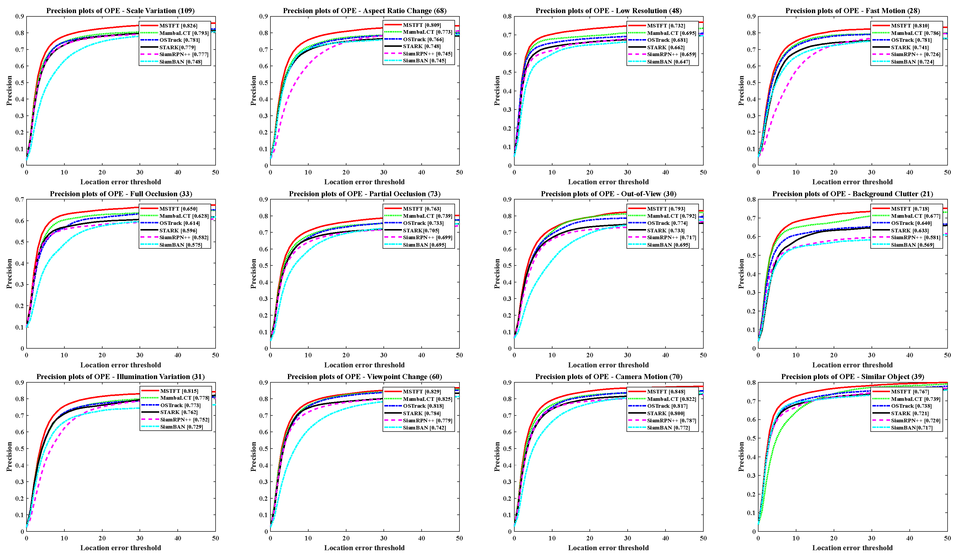 - Resistance to Background Clutter. When confronted with background clutter, MSTFT attained a success AUC of (Table 2), surpassing TrackingMiM by percentage points. Figure 5 shows that its precision remains above even at small location error thresholds (≤10 pixels), highlighting strong clutter rejection. This performance is attributed to the synergistic operation of the Bi-STM and DTF-AA modules: the Bi-STM captures the target’s motion trend (e.g., a pedestrian’s walking direction in a crowd) through temporal dynamic modeling, distinguishing it from static distractors; the DTF-AA employs a size-aware attention mechanism that dynamically adjusts the attention window relative to the target size (e.g., a pixel window for a pixel target), thereby minimizingM interference from semantically similar background objects during template fusion.