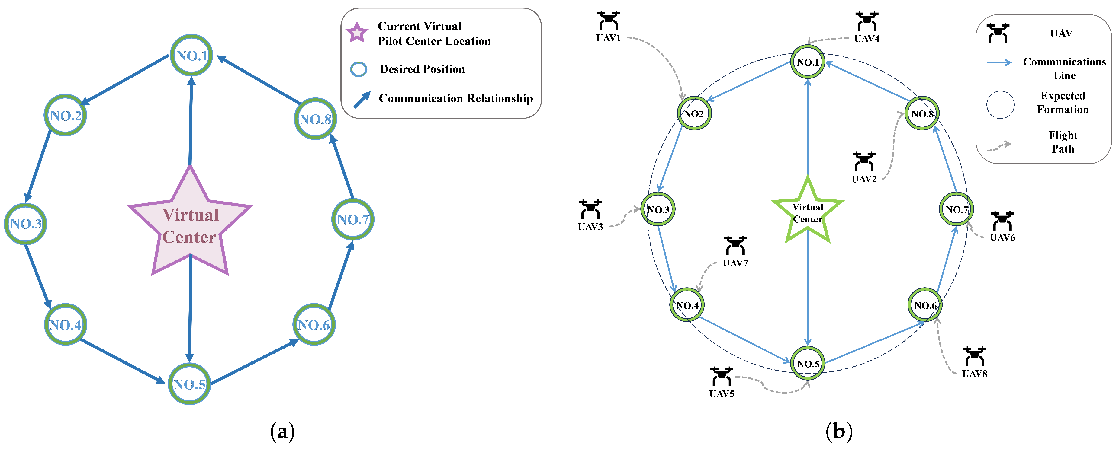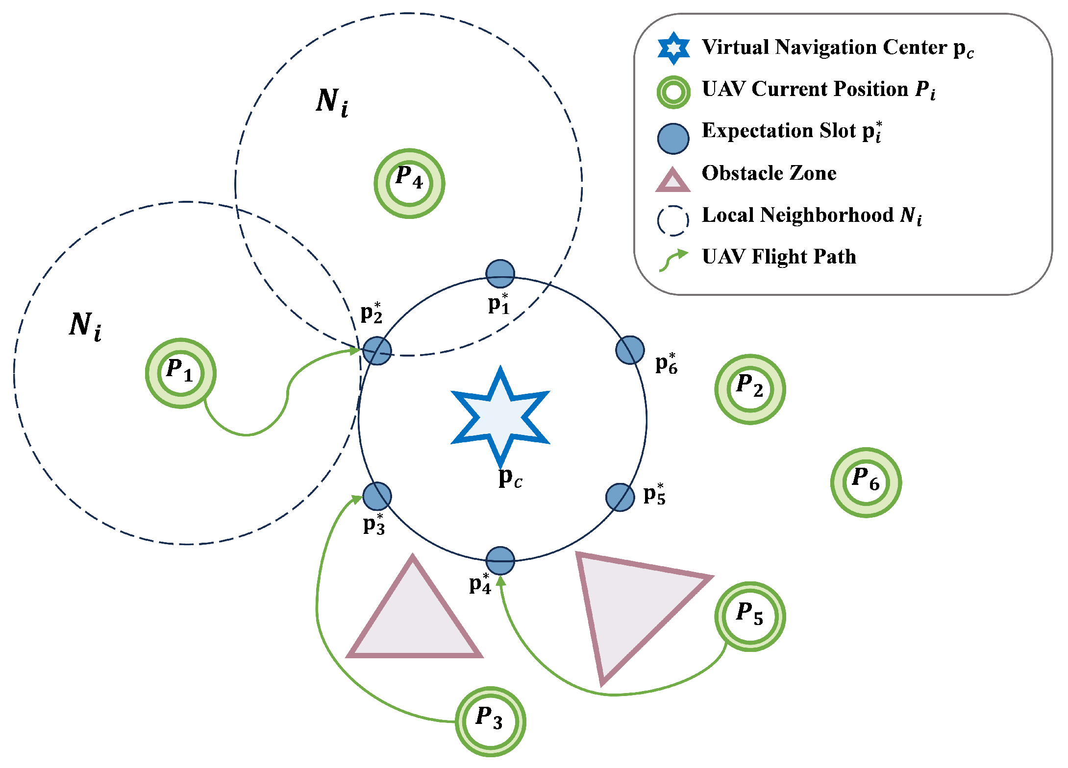 - Designed a dynamic position allocation and virtual center framework: Employing a virtual center-follower architecture, an annealing simulation algorithm is introduced to solve online for the optimal drone position mapping under the current state. This enables each UAV to be dynamically assigned to the most advantageous position at any given moment (rather than through pre-fixed allocation). Concurrently, a dynamic virtual center—adjusted in real time based on the cluster’s current center of mass—is proposed. This provides a dynamic reference for position allocation, thereby achieving rapid formation convergence.