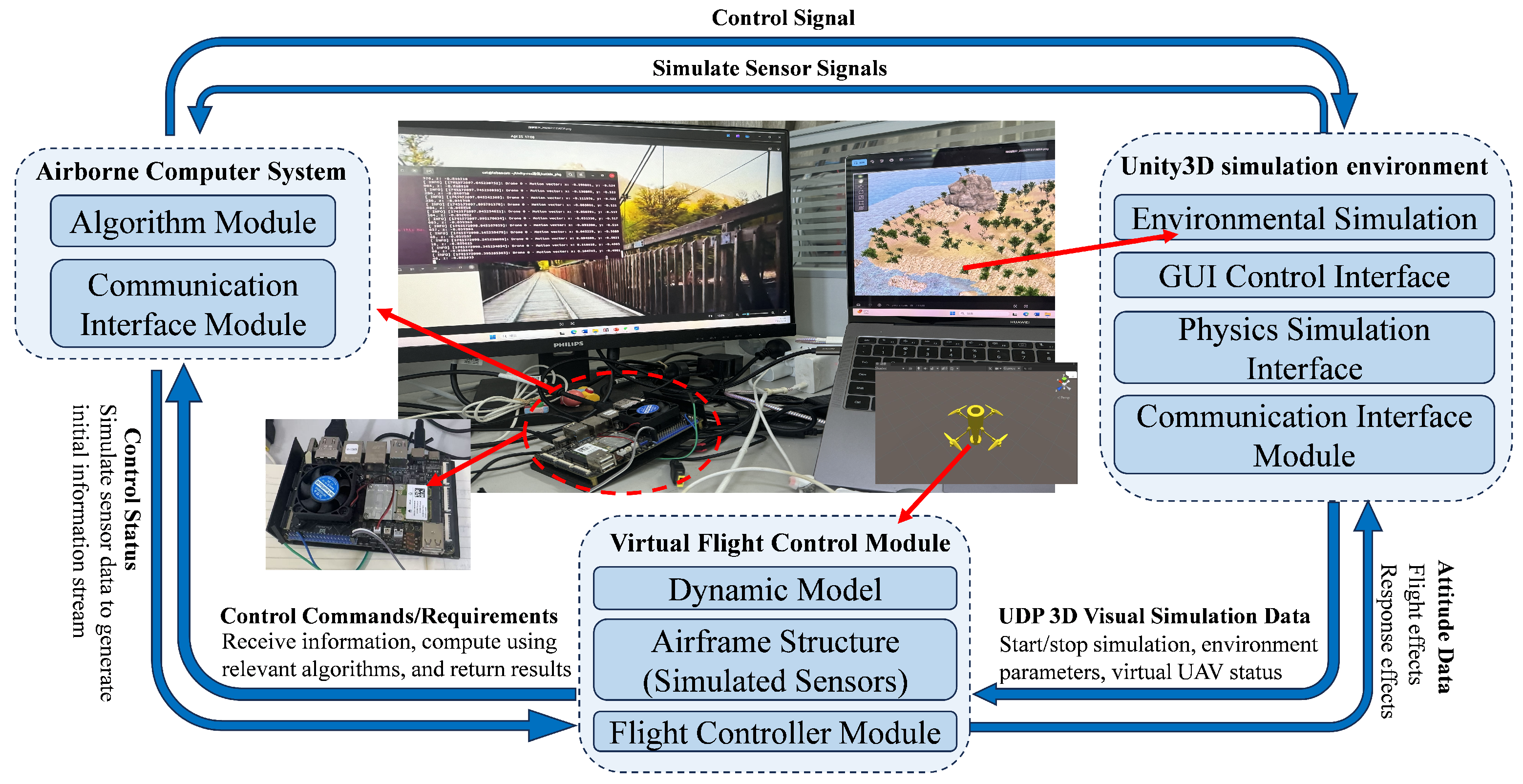 - A Hardware-in-the-Loop (HIL) verification architecture was established: To address the limitations of traditional numerical simulation in practical application validation, a virtual combat platform was developed using the Unity3D engine. This architecture integrates real control loops with a virtual environment, enabling closed-loop testing of algorithms in simulated real-world scenarios and significantly enhancing the credibility of verification results.