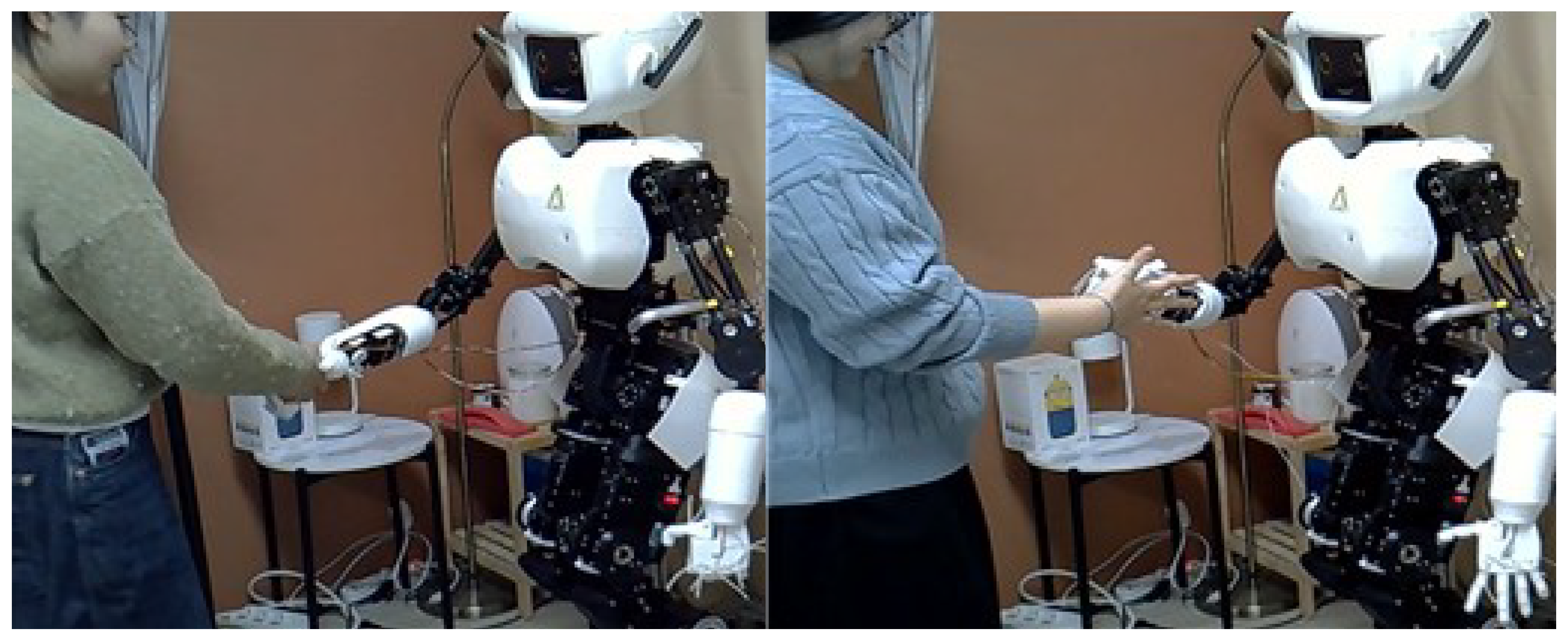 | Curiosity/Novelty | “It felt mechanical but interesting.” “The way the robot hand moved was strange but fun.” | “It felt like a real human hand, so it was fascinating.” “I was surprised by the natural movement.” |