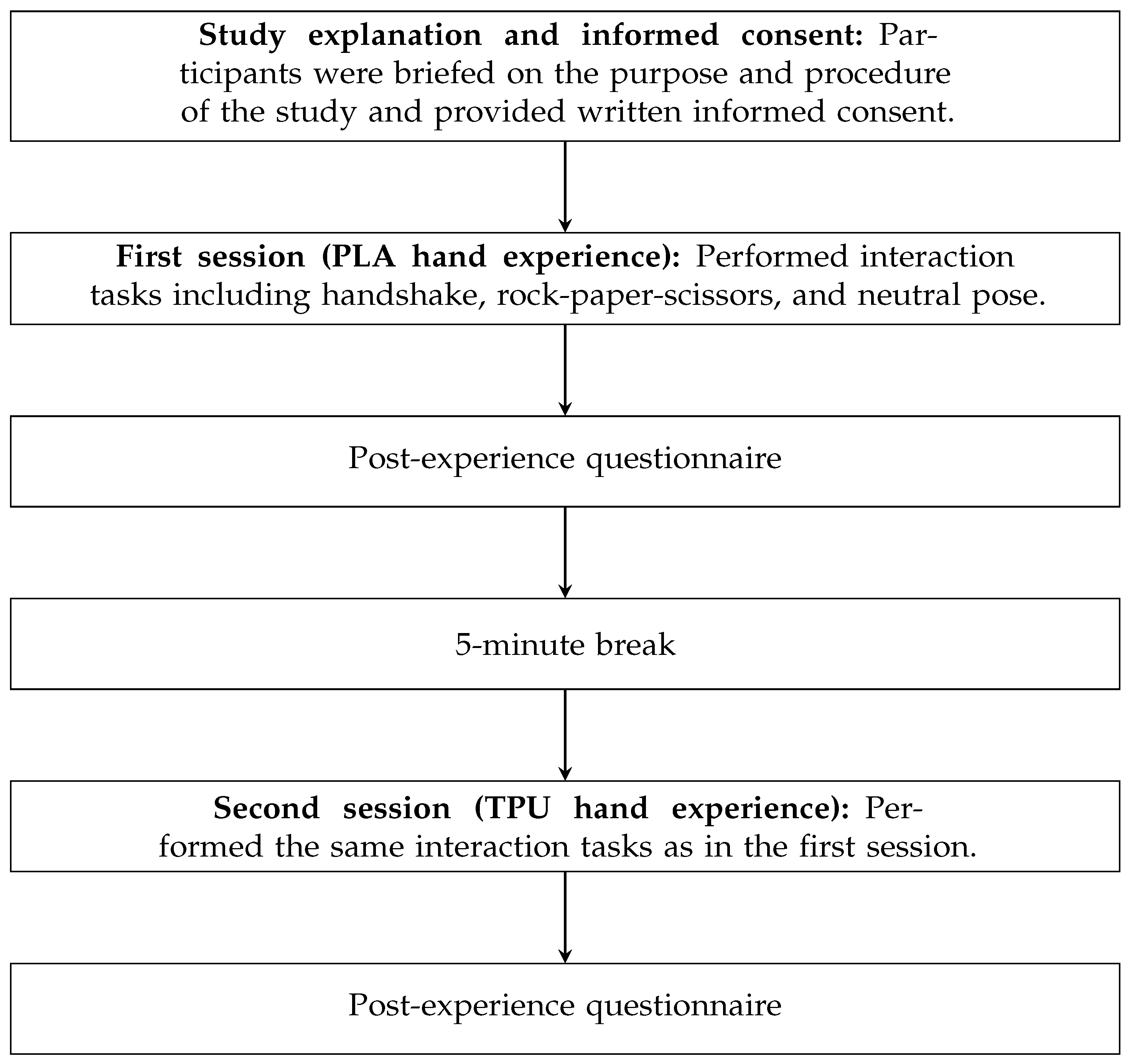 - Provides an experimental comparison of anthropomorphic robotic hands with identical structural designs but distinct material compositions (TPU vs. PLA), highlighting their differential impact on user experience.