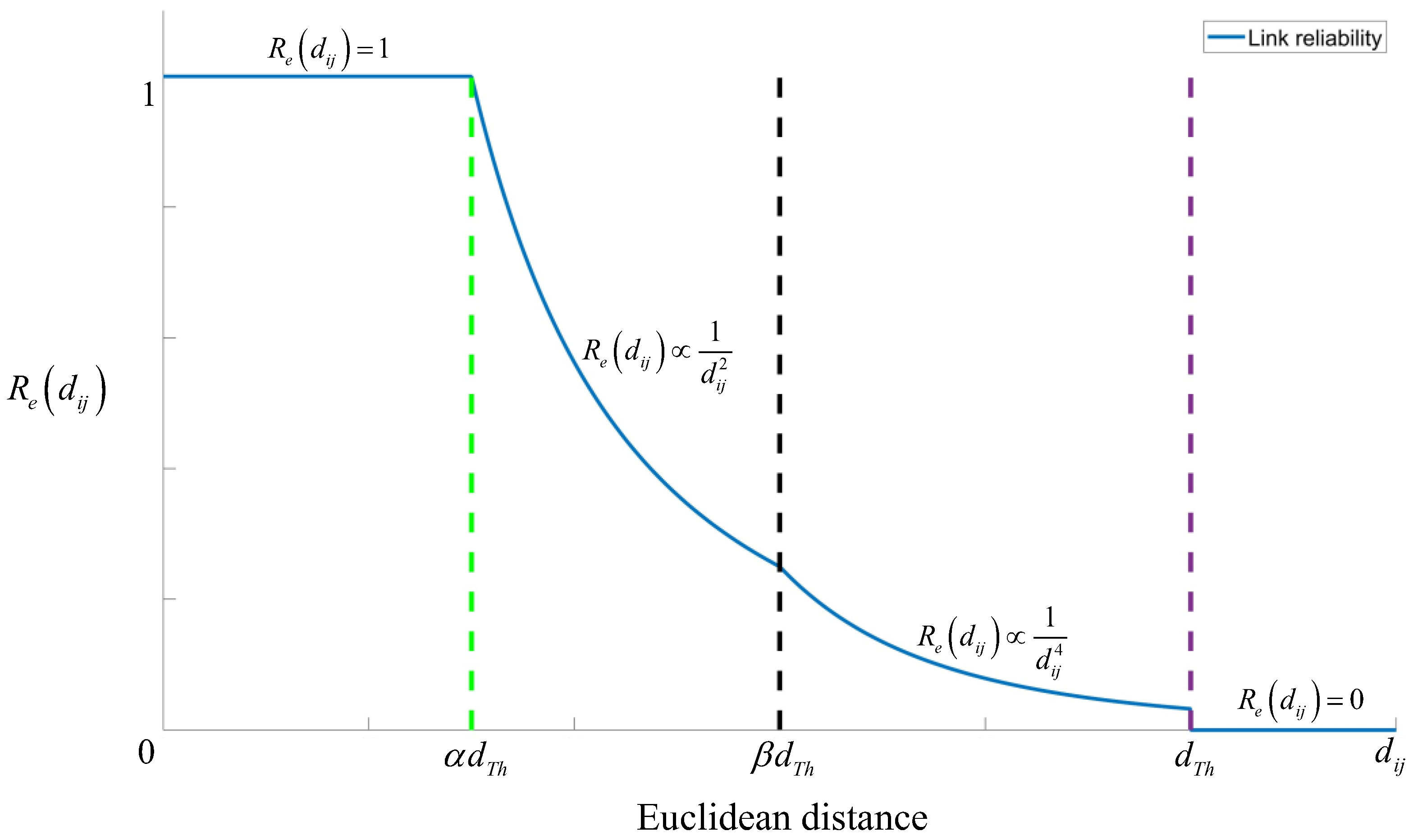 - Exceeding communication distance threshold (): The nodes are beyond each other’s radio transmission range, and the link reliability is 0. The graphical representation of the link reliability model is shown in Figure 2.