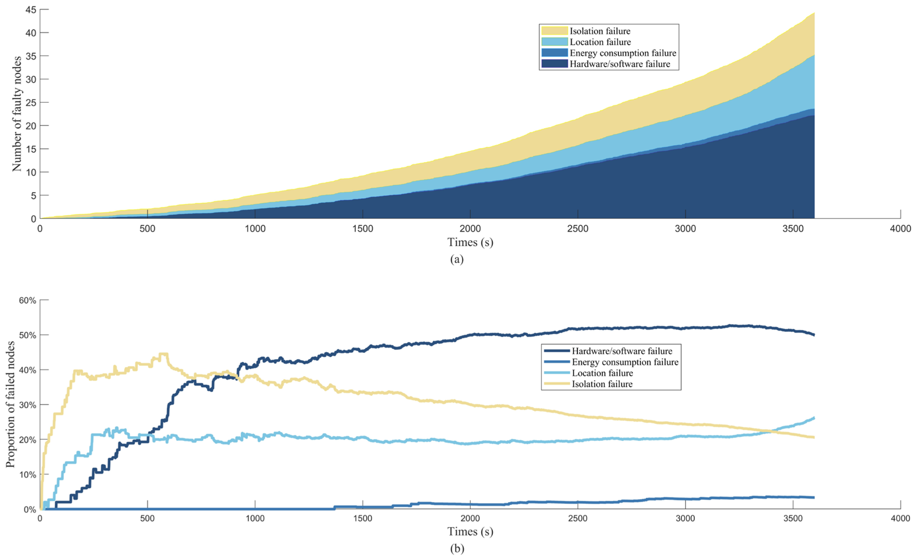 - Determine whether a node has experienced a hardware/software failure: For all nodes in the current , calculate the probability of hardware/software failure at each node according to the formula , and compare it with a random number . If , the node is identified as failed. We update the node sets as (add to hardware/software failure set) and (remove from normal node set). After checking all nodes in , if (there are still normal nodes), proceed to step (3); otherwise (no normal nodes remain, and the network is non-functional), proceed to step (12) to terminate the algorithm.