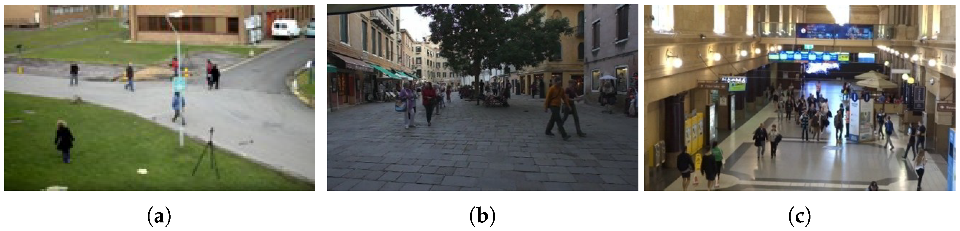 - Ristani, E.; Solera, F.; Zou, R.; Cucchiara, R.; Tomasi, C. Performance measures and a data set for multi-target, multi-camera tracking. In Proceedings of the European Conference on Computer Vision, Amsterdam, The Netherlands, 11–14 October 2016; Springer: Berlin/Heidelberg, Germany, 2016; pp. 17–35. [Google Scholar]