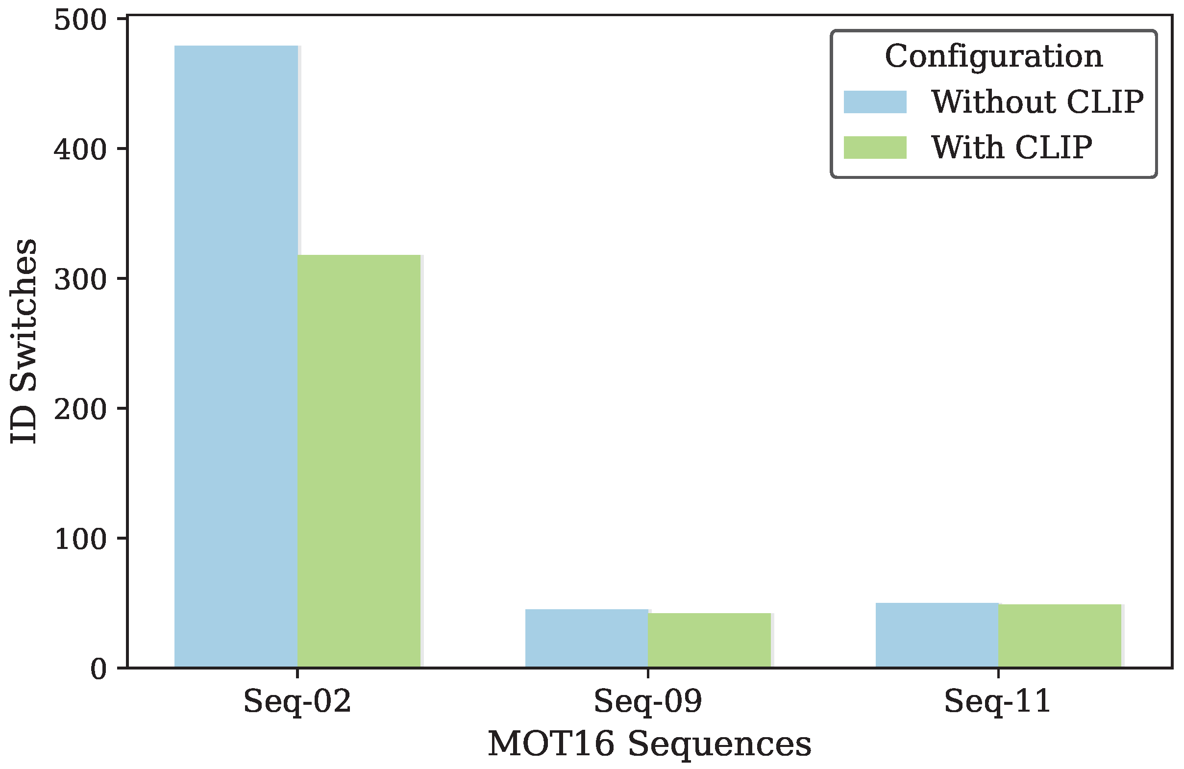 - CLIP integration on PETS09-S2L1 reduced IDSW by approximately 60%, demonstrating significant improvements in identity consistency.