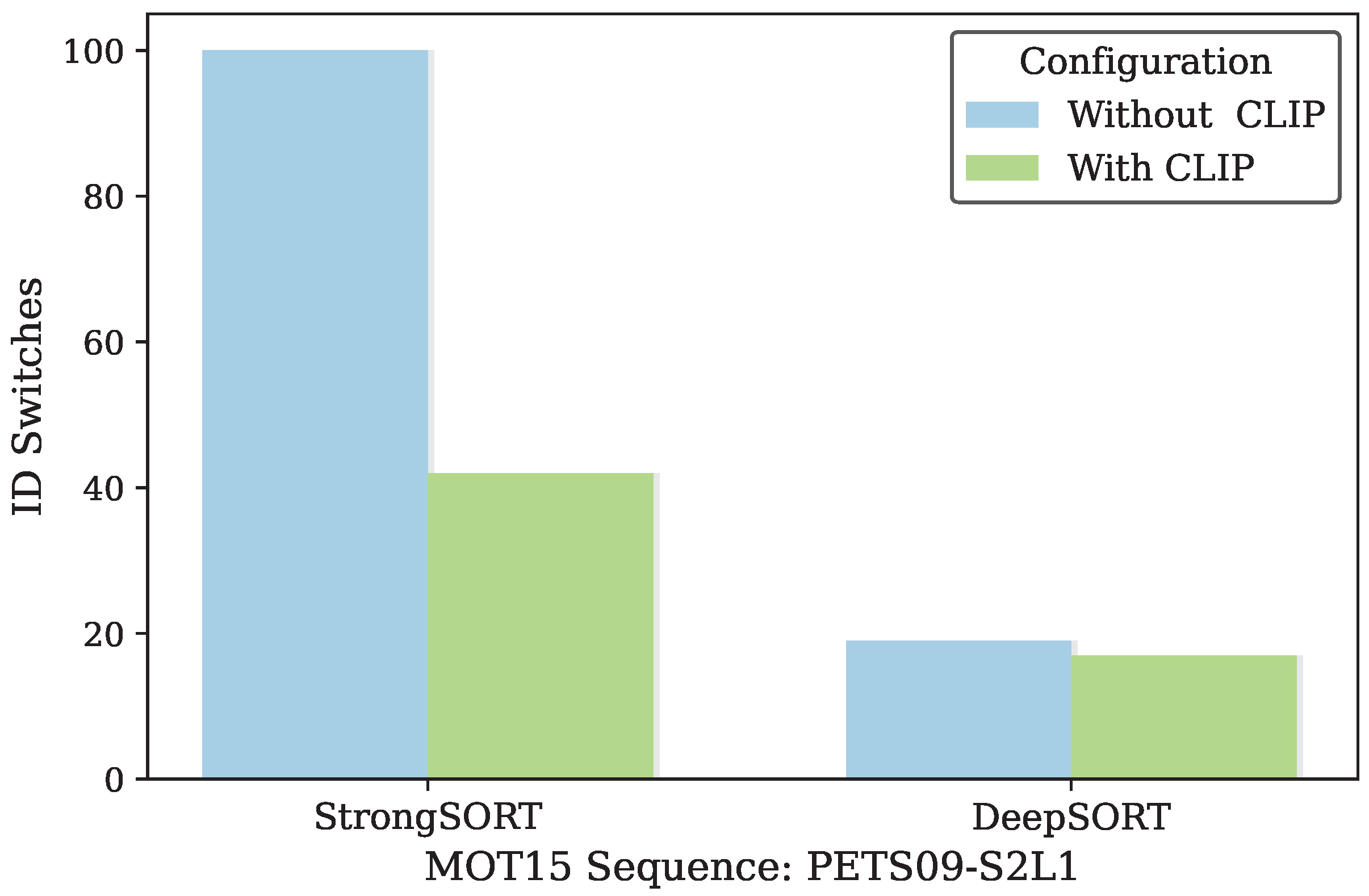 - On PETS09-S2L1, integrating CLIP reduced ID switches from 19 to 17, demonstrating improved identity tracking.
