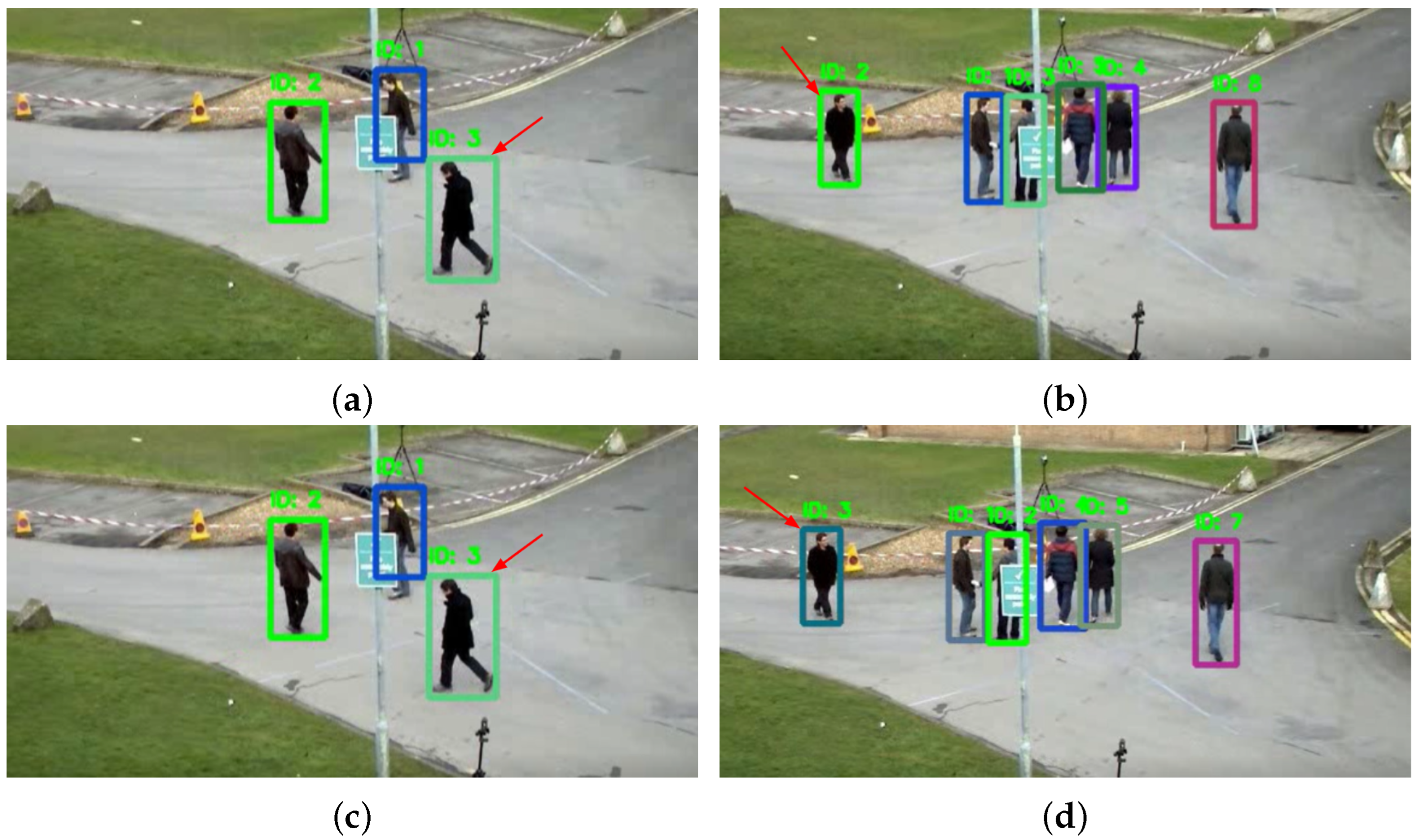 - Wojke, N.; Bewley, A.; Paulus, D. Simple Online and Realtime Tracking with a Deep Association Metric. In Proceedings of the 2017 IEEE International Conference on Image Processing (ICIP), Beijing, China, 17–20 September 2017; IEEE: New York, NY, USA, 2017; pp. 3645–3649. [Google Scholar] [CrossRef]