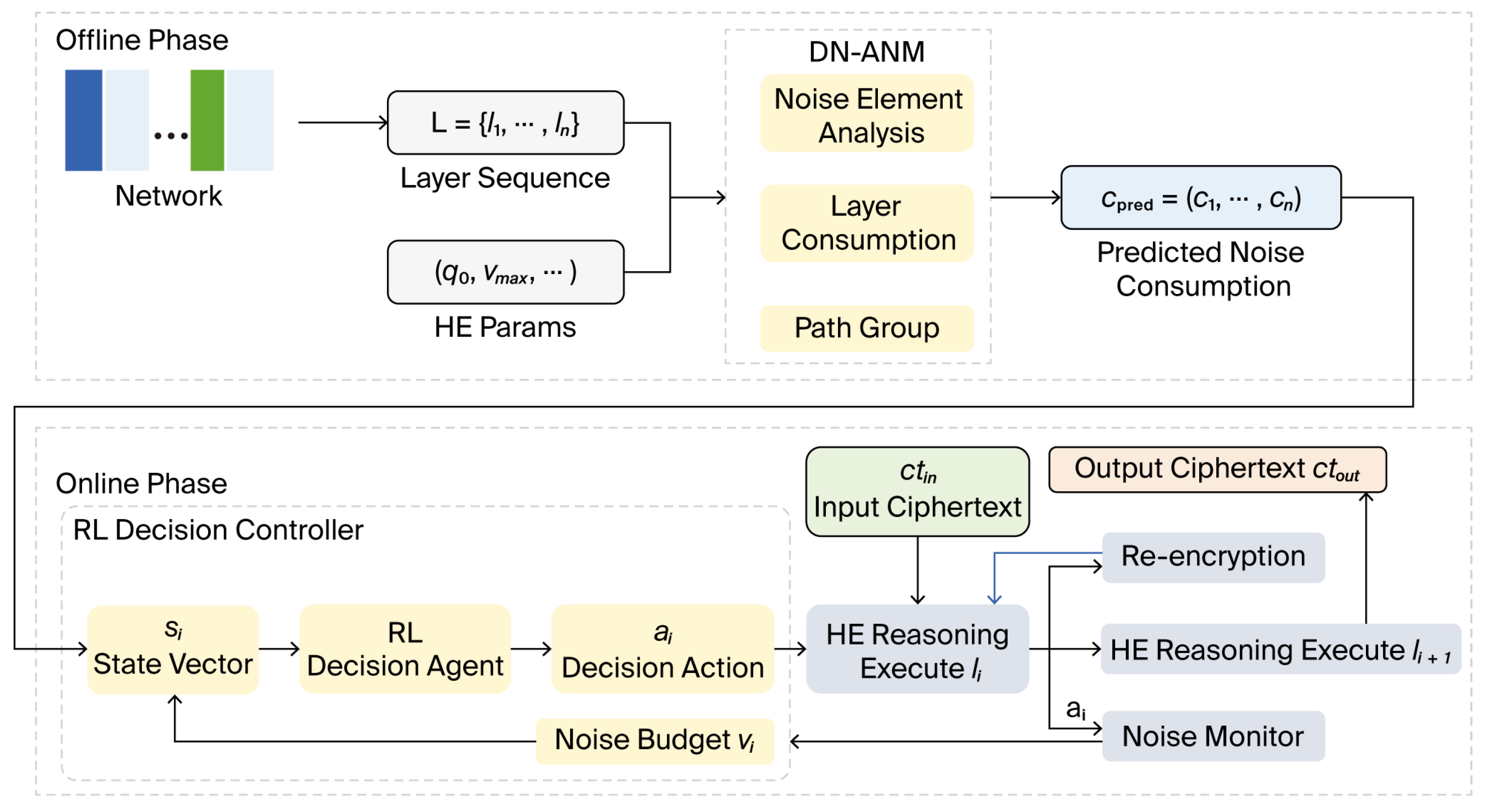 - To address the problem that existing HE schemes use fixed noise budget allocation strategies, which cannot adapt to the heterogeneous computational characteristics between deep network layers, we propose a Deep Network-aware Adaptive Noise-budget Management mechanism. By constructing a layer-aware noise consumption prediction model, this mechanism achieves dynamic and precise allocation of the noise budget.
