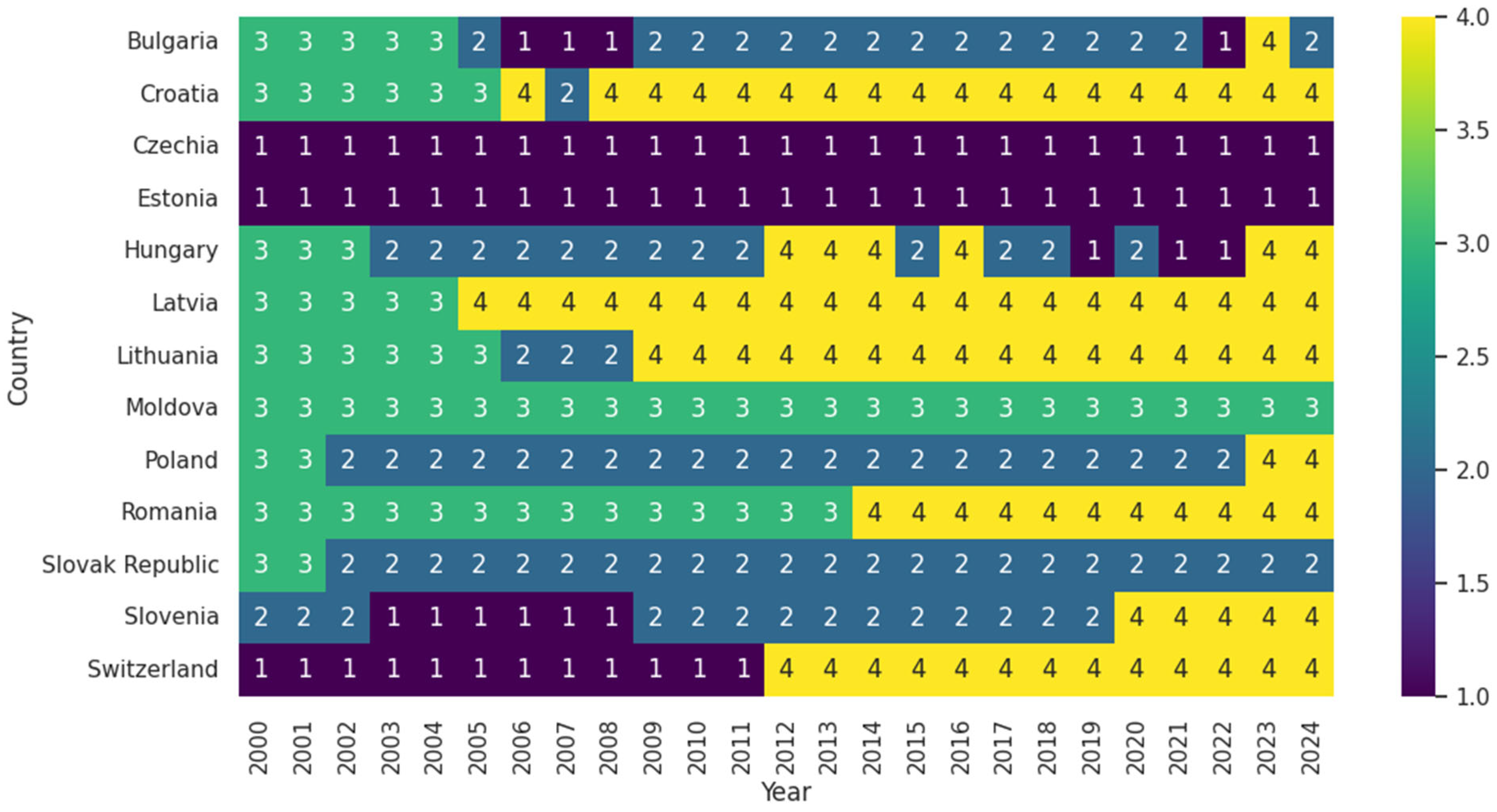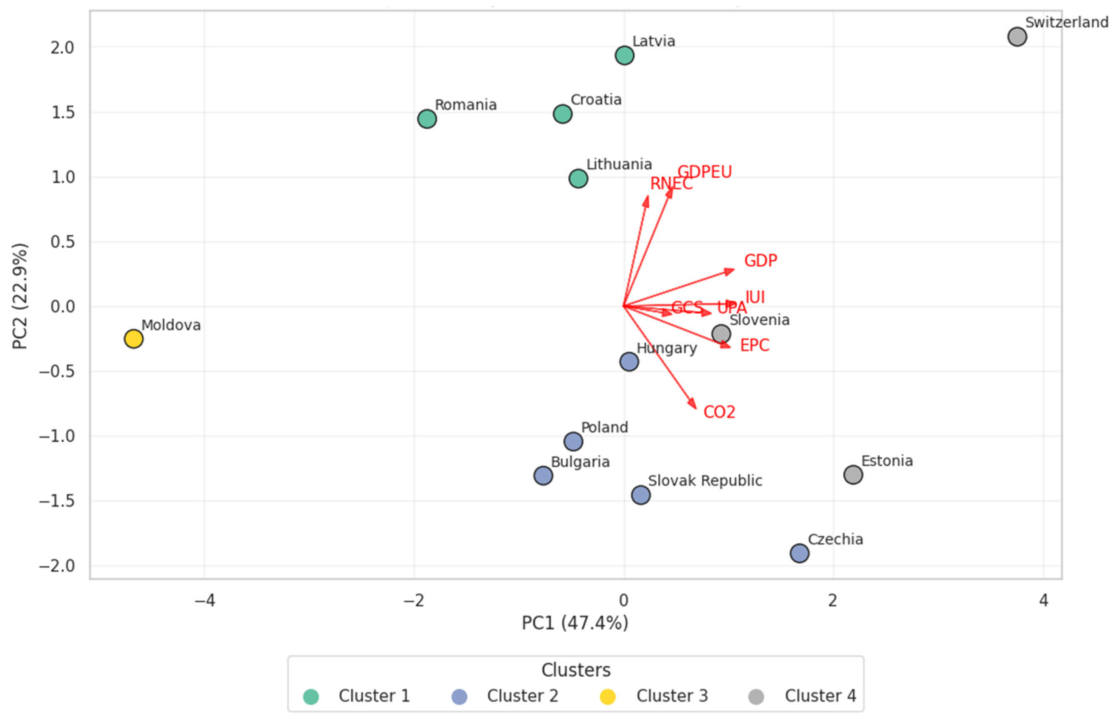 | Advanced Non-EU High-Performer | Switzerland | Provides an upper-benchmark reference for energy efficiency, technological sophistication, innovation capacity, and smart transition maturity [44,45,46]. |