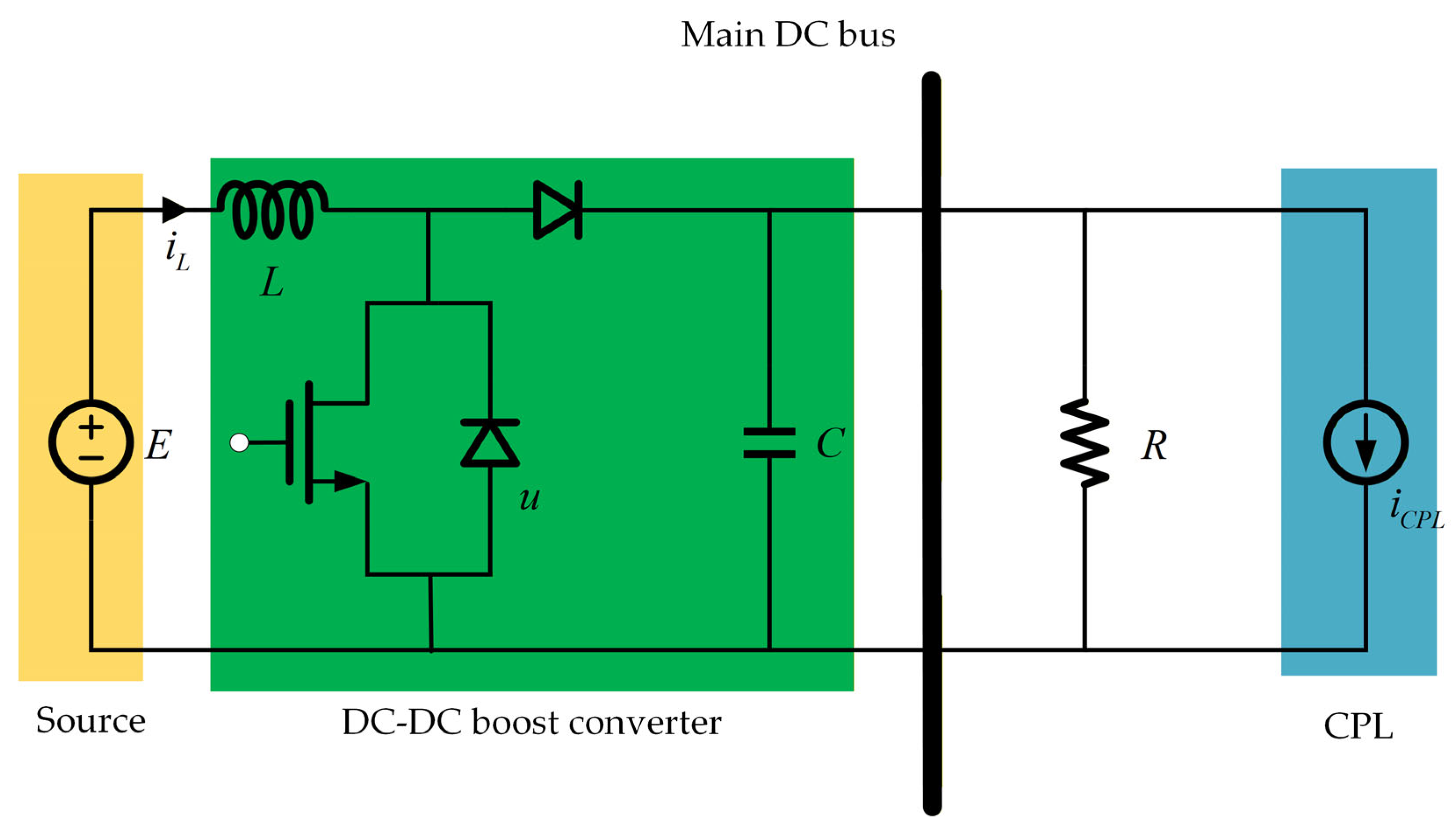 Figure 2, it can be seen that the DC source and the CPL represent the supply side and the demand side, respectively. In this mode, the DC source delivers regulated energy to the DC bus through the DC–DC boost converter. At the other end of the main bus, a CPL is connected, which is regarded as a type of load strictly regulated through a converter.