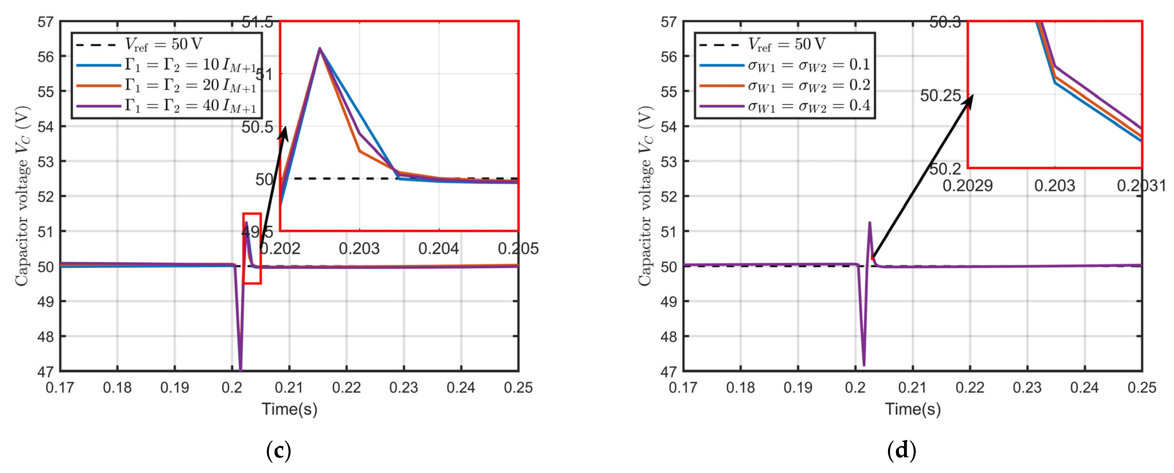 The external disturbances and load variations considered in this paper (e.g., CPL power steps) are assumed to be bandwidth-limited with finite variation rates. To ensure effective disturbance estimation, the convergence rate of the disturbance estimation error is adjusted by tuning the learning gains and as well as the leakage coefficients and . As a result, the observer dynamics are rendered significantly faster than the disturbance variation time scale, thereby achieving time-scale separation. Simulation results demonstrate that, with the selected parameters, the disturbance estimates converge within a time interval much shorter than the load variation interval after abrupt disturbance changes, ensuring effective disturbance compensation over the entire operating range.