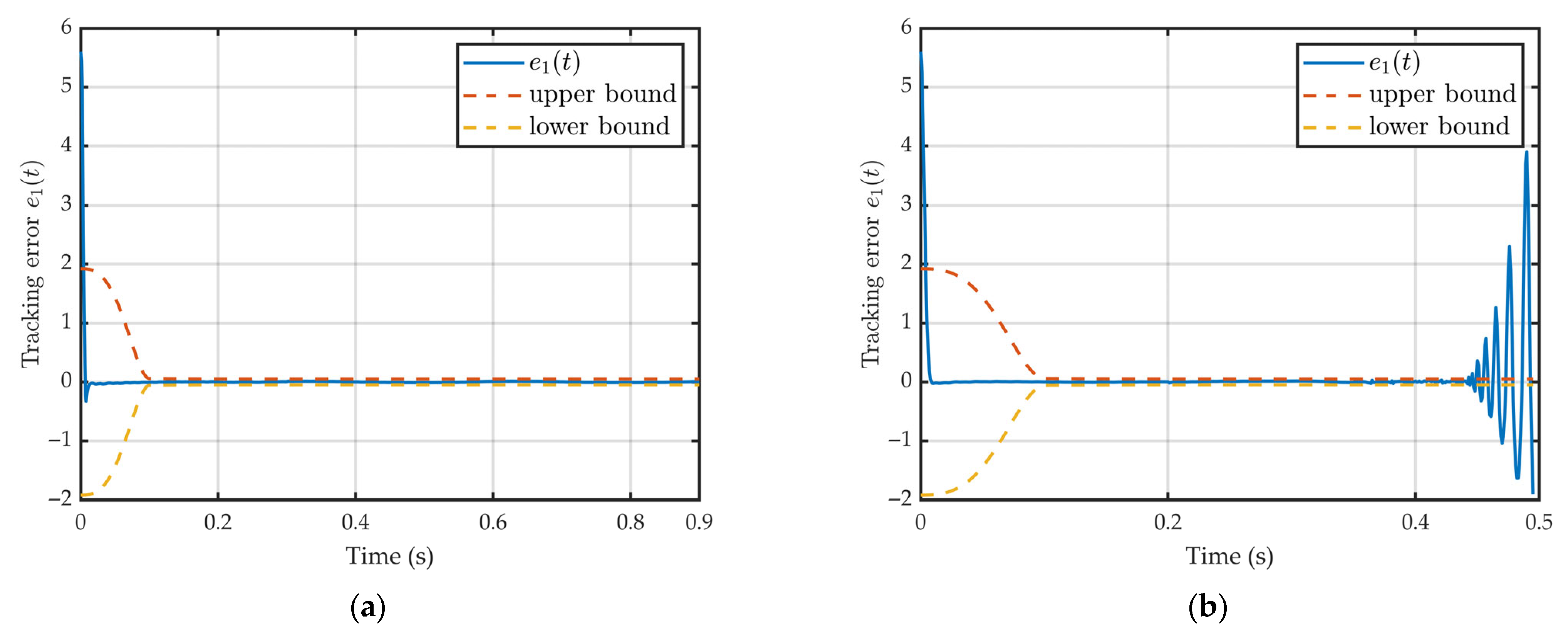 According to Lemma 1, remains bounded and decays exponentially, implying that , and are all semi-globally uniformly ultimately bounded. Moreover, invoking Lemma 2 and selecting the performance function , and appropriately ensures that approaches a small neighborhood around zero. Hence, the proof is completed. □