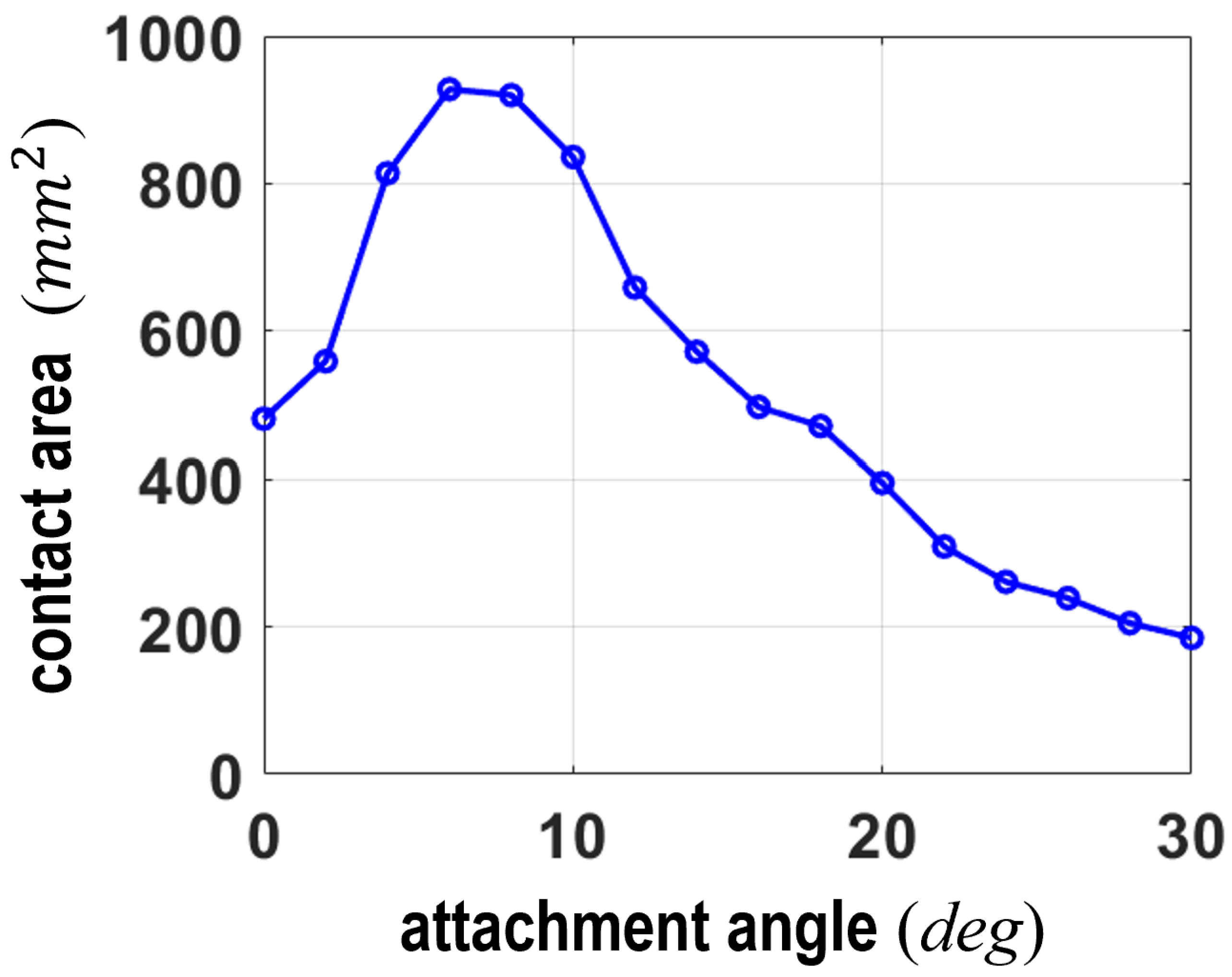 Figure 8. This graph indicates that the contact area increases sharply from 0° to 8°, reaching a maximum of approximately 950 mm