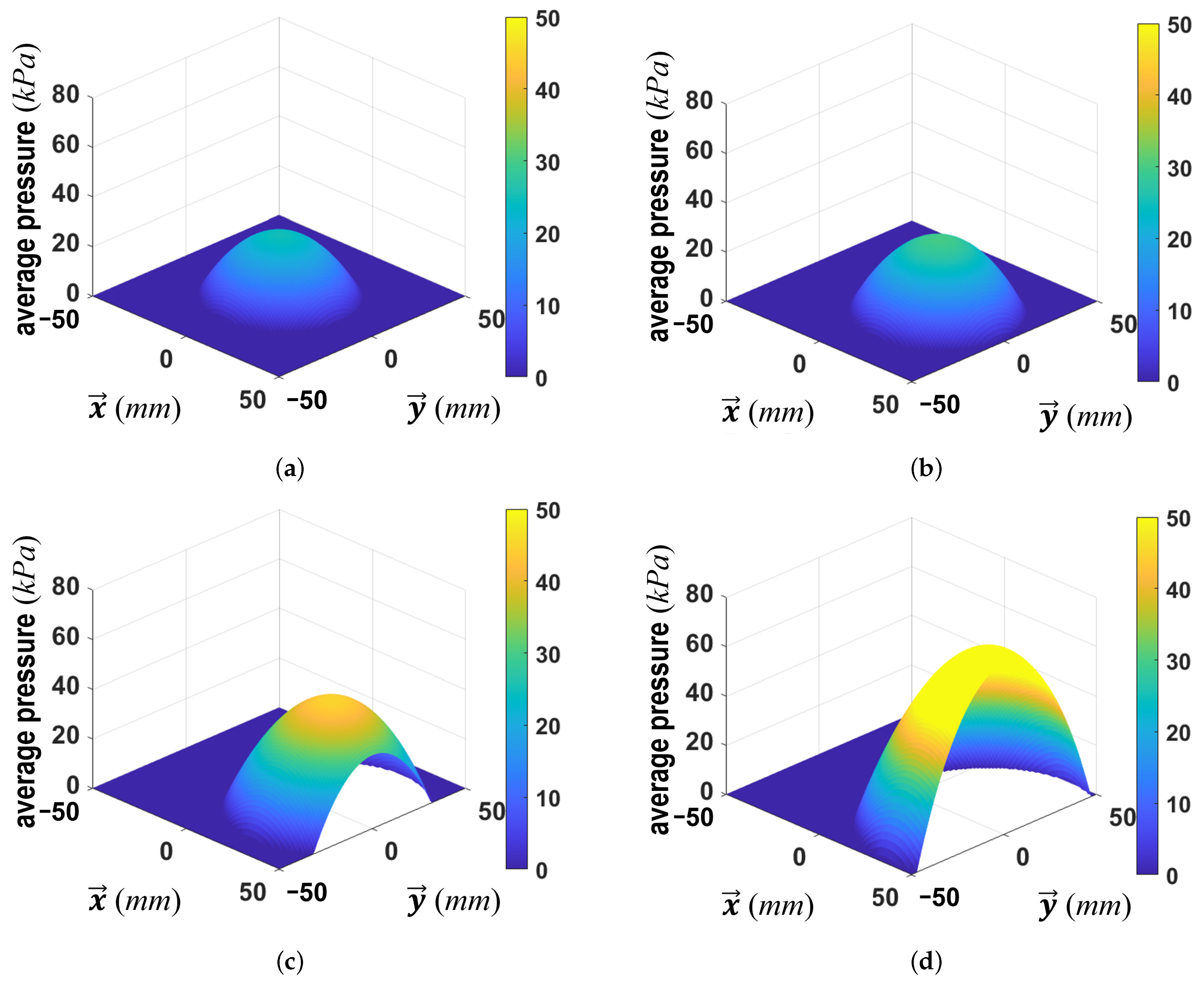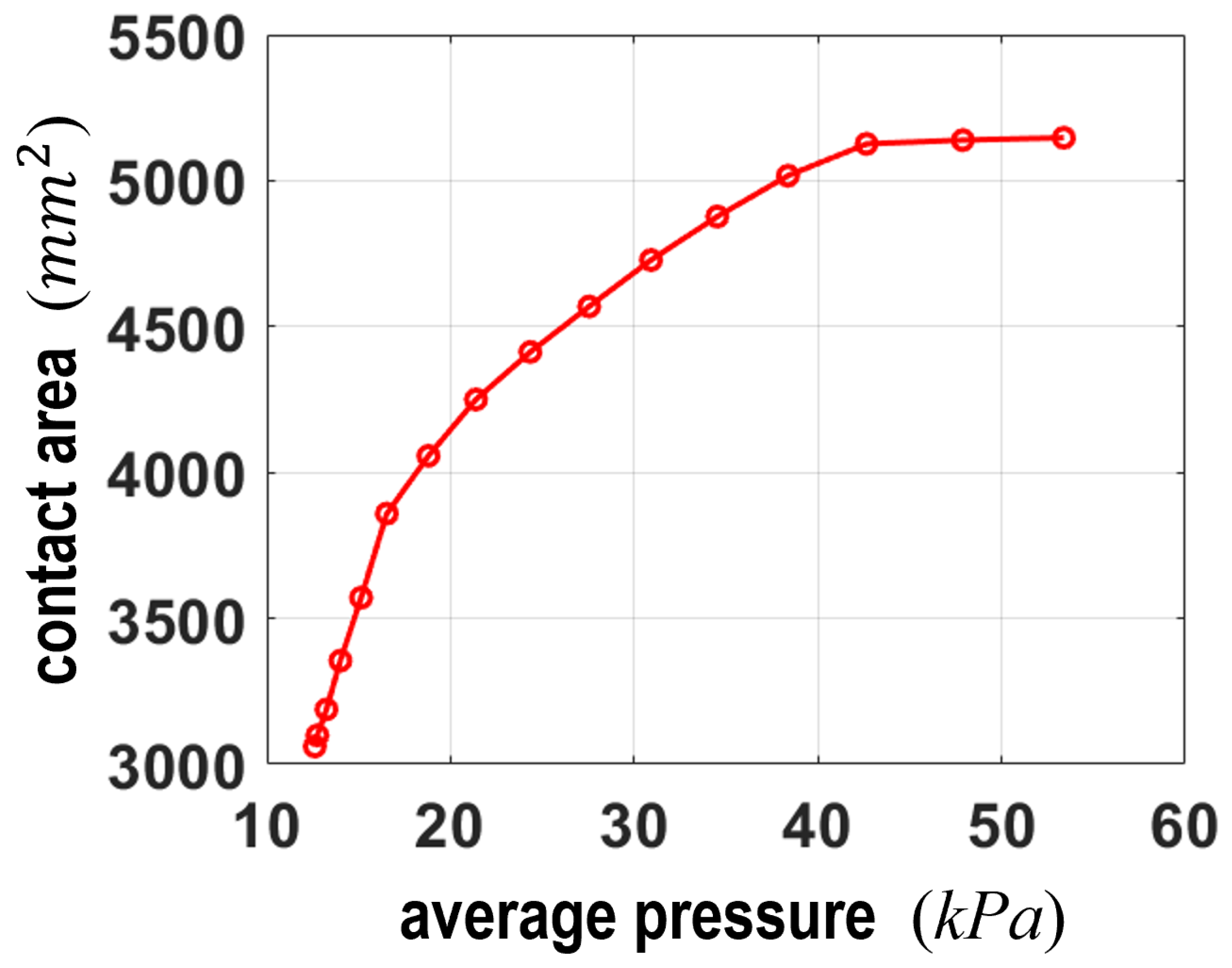 Figure 12 illustrates the analytic relationship between contact area and pressure. The results showed that pressure generally increased as the contact area expanded. While the contact area reached a saturation point at approximately 5200 mm