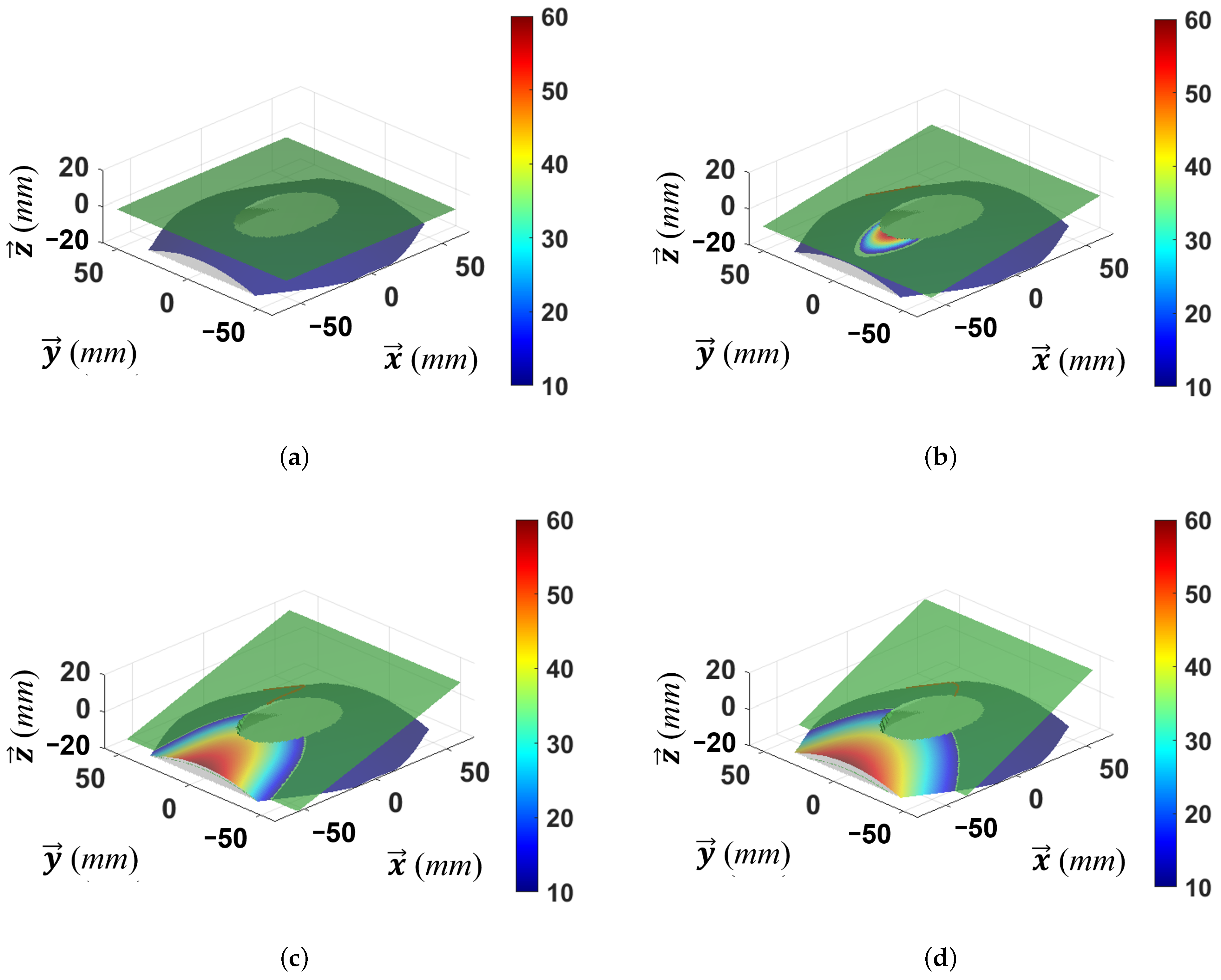 Figure 9 further illustrates the contact interface between the attachment, represented by the purple square, and the toilet seat, represented by the colored curved surface. Simultaneously, these graphs visualize in 3D how variations in