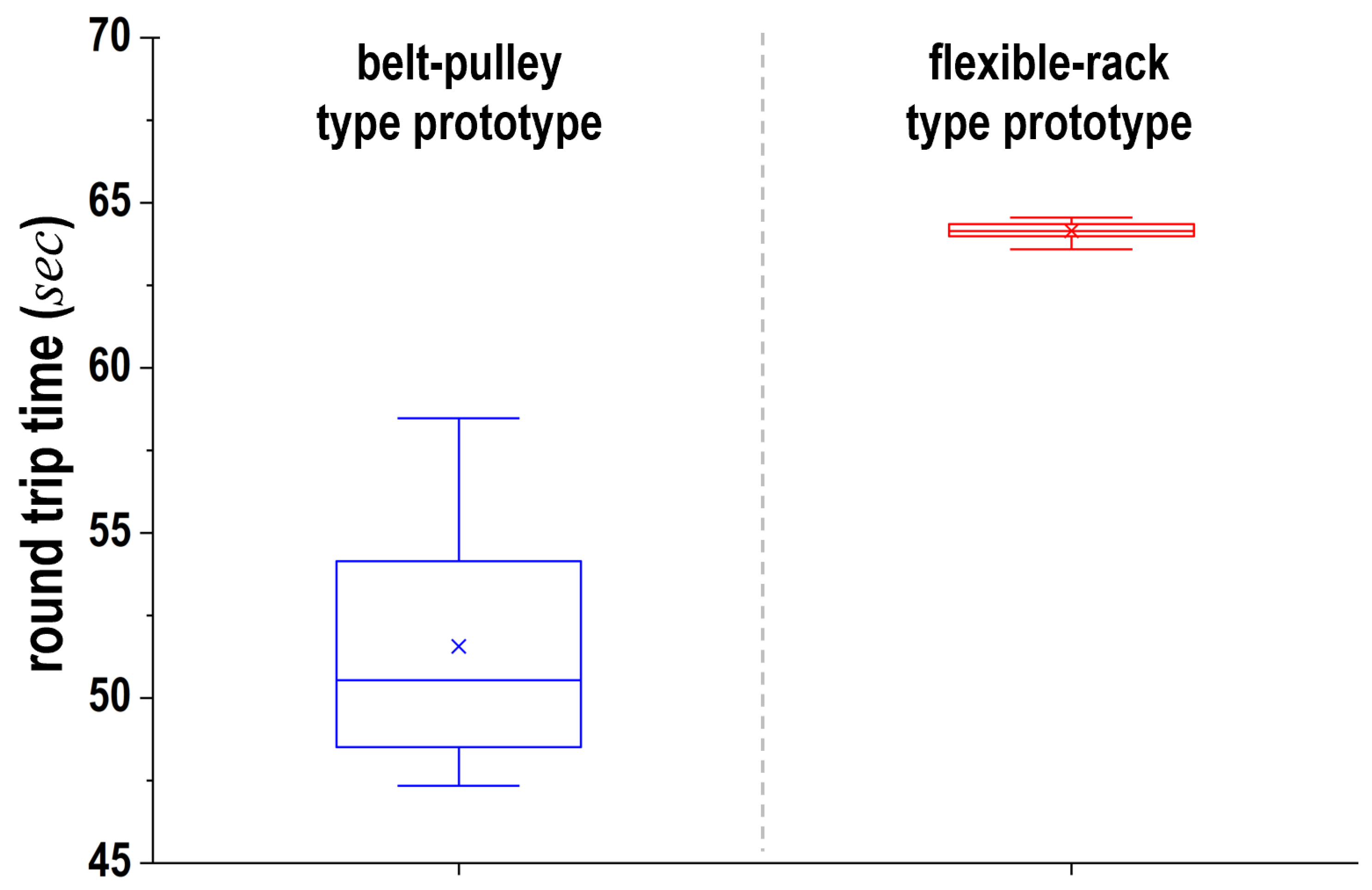 Next, a performance comparison was conducted between the belt-pulley and the flexible-rack type prototypes during the cleaning operation. Specifically, the time required to complete one cleaning cycle was measured. These experiments were performed 50 times for each prototype. The statistical data were presented in the box-and-whisker plots shown in