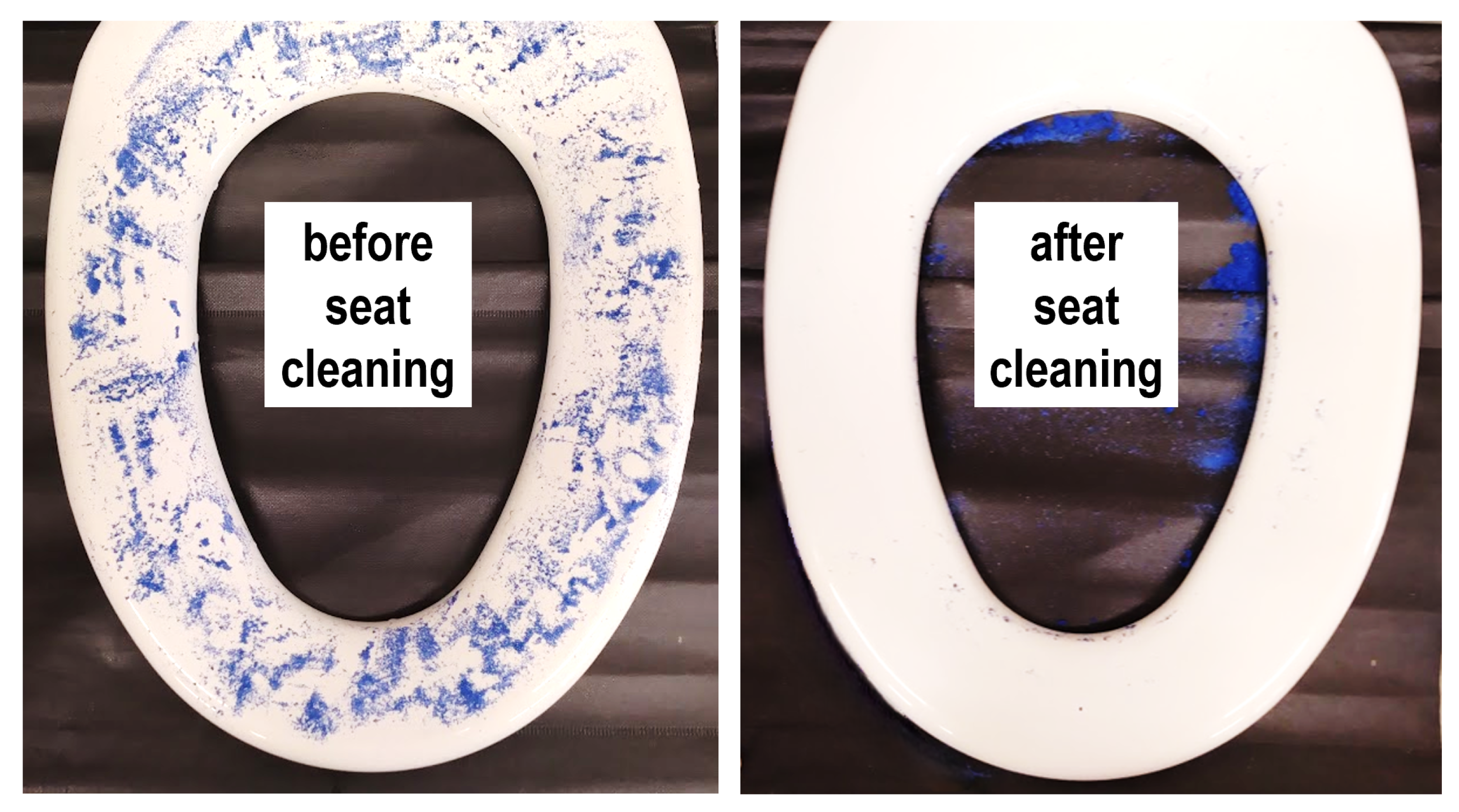 Figure 17). These experiments assessed the effectiveness of the seat-cleaning system in removing blue dried stains that had been artificially applied to the seat surface. The left side of