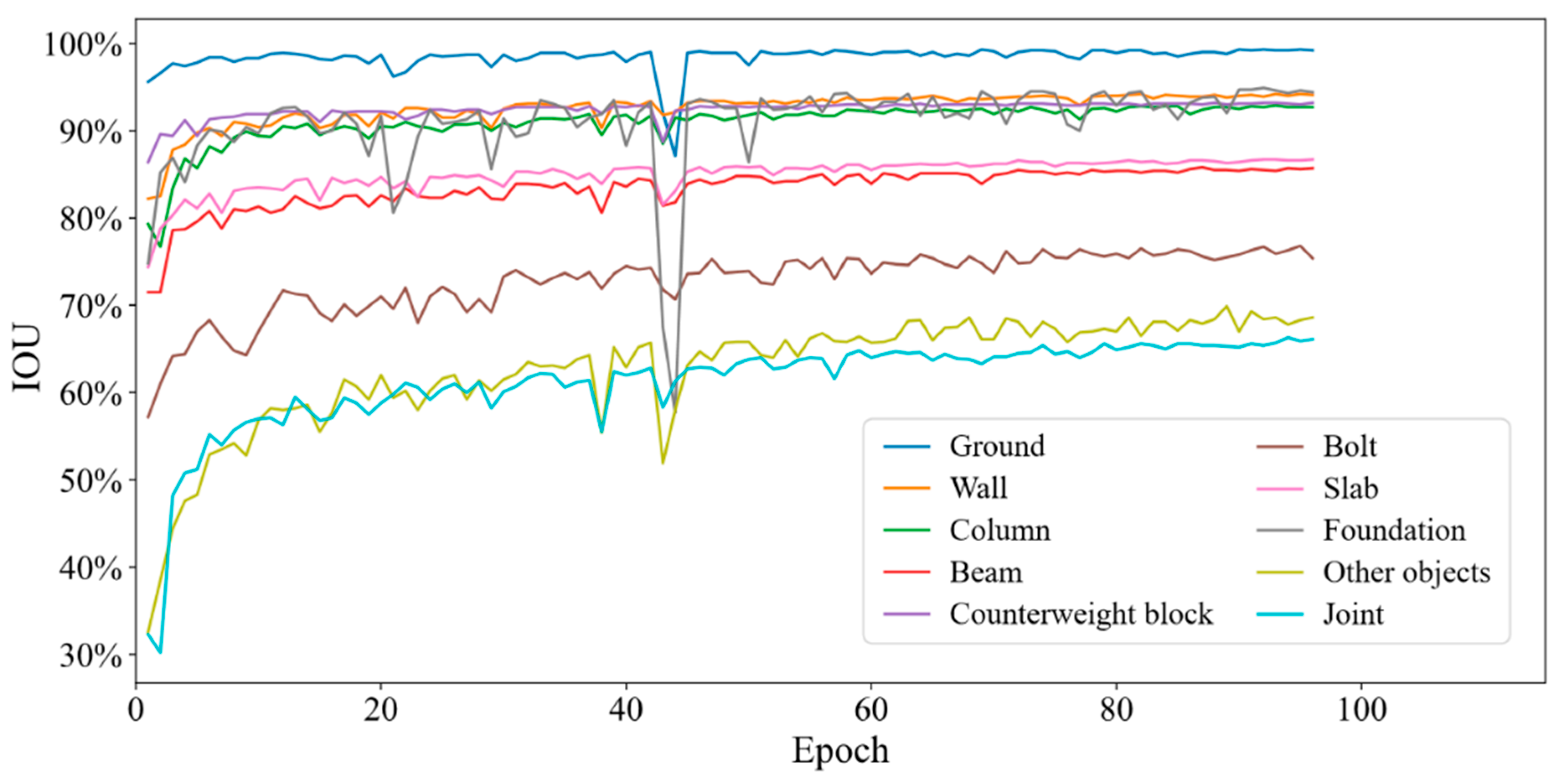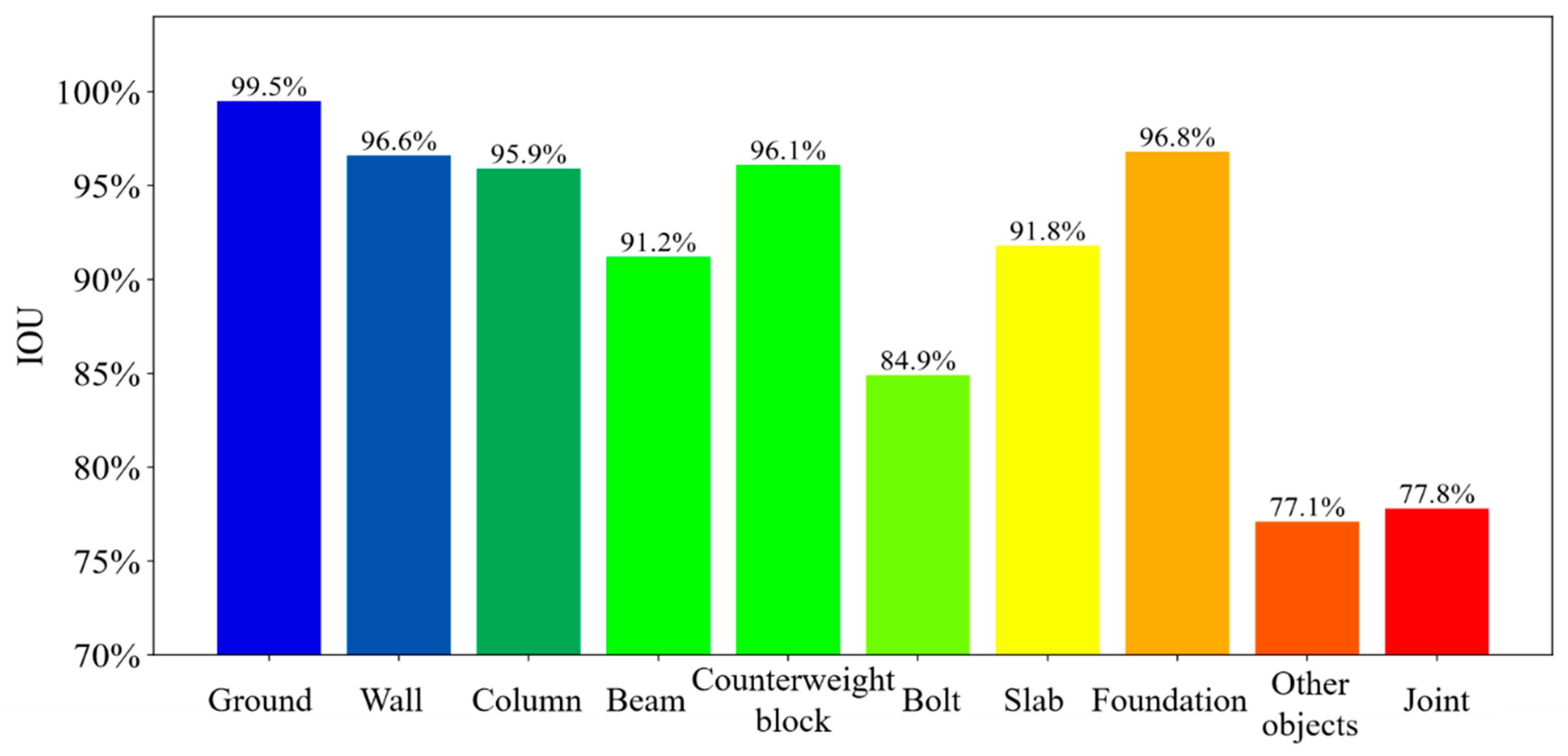 - High-Performance Semantic Segmentation: The trained PointNet++ network demonstrated exceptional robustness in classifying structural components. Quantitative evaluations on the test set yielded an Overall Accuracy (OA) of 97.8%, a Mean Accuracy (mAcc) of 94.92%, and a Mean Intersection over Union (mIoU) of 90.8%. Notably, critical structural elements such as beams, columns, and slabs all maintained IoU scores exceeding 90%, proving that the data augmentation strategy effectively mitigated class imbalance and ensured reliable recognition even in the presence of noise.