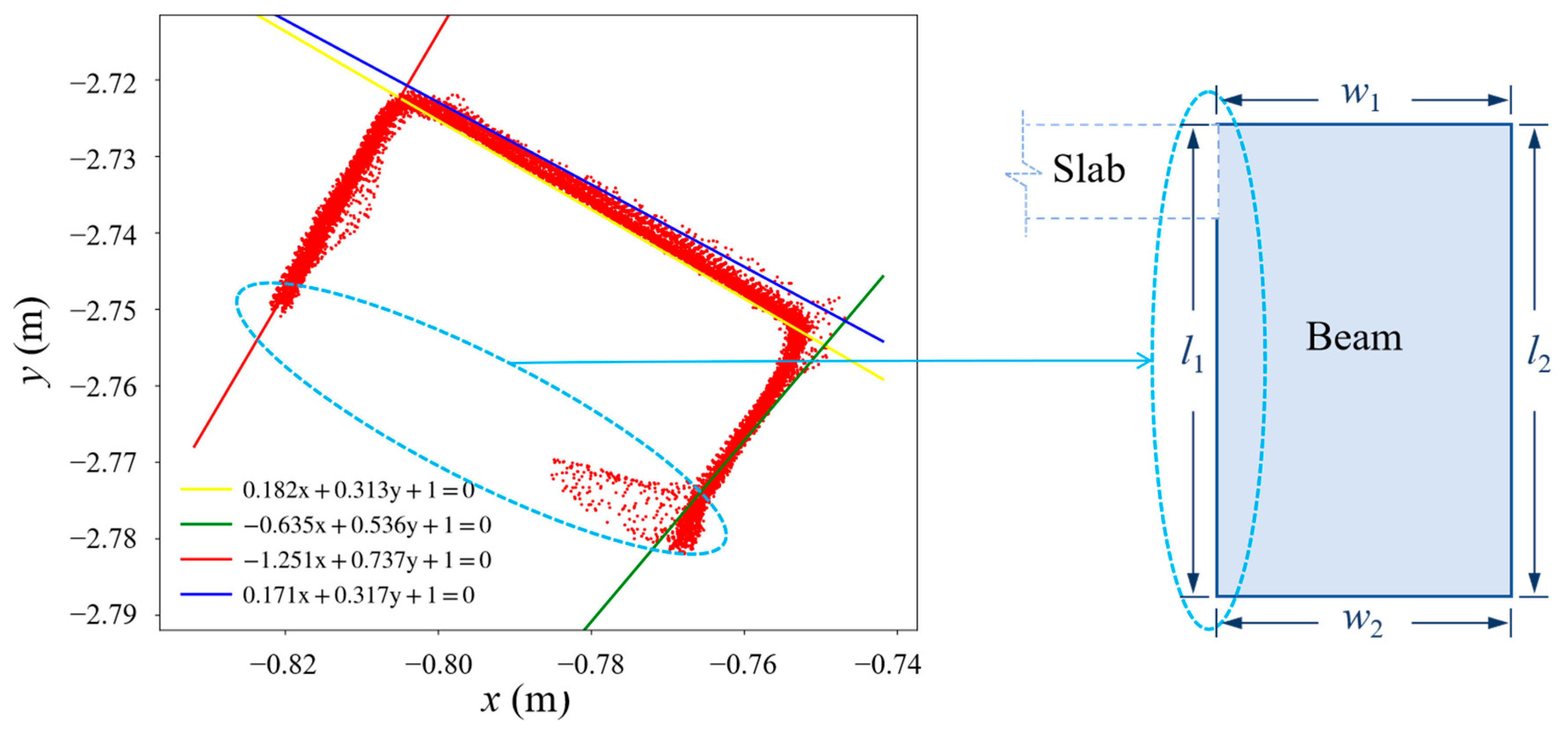 - Precise Dimension Extraction and Geometric Accuracy: Experimental validation confirmed that the proposed geometric extraction algorithm satisfies the accuracy requirements for engineering reverse modeling. For structural components with complete data coverage, the average dimensional error for columns ranged from 1.4 mm to 2.0 mm, while beams exhibited average errors between 1.6 mm and 2.3 mm, excluding specific occluded cases. These results indicate that the integration of PCA dimensionality reduction and RANSAC boundary fitting can effectively resist point cloud noise and accurately restore the As-Built dimensions of existing structures.