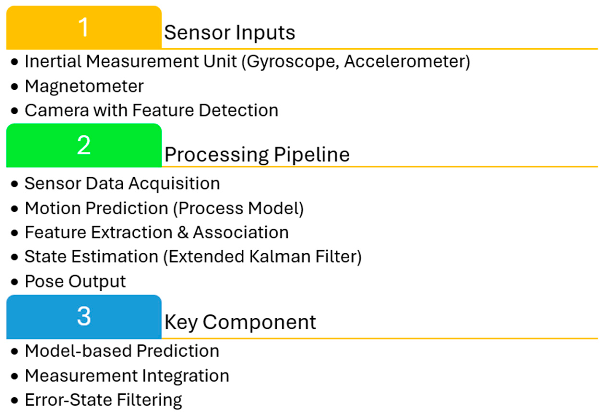 | 1. | EKF (a + g + m) | Long-term drift correction; widely used, balance of accuracy/compute | Nonlinear model; requires tuning Jacobians | ~2–4° orientation |