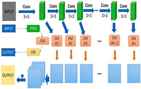 FEM is the feature extraction module, which is a single-stream network with 10 convolutional layers, each using a kernel size of , step length of 1, and ReLU nonlinear, without pooling operations. The initial input is a low-light color image. The output from each layer serves as both the input for the subsequent layer and for the corresponding subnet within the EM.
