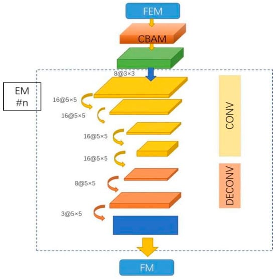 The EM comprises subnets corresponding to the number of layers in the FEM. Each subnet uses the output of a certain layer in the FEM as input to generate a color image of the same size as the original low-light image. Each subnet features a symmetric structure, incorporating both convolution and deconvolution operations. The first convolution layer uses eight convolution nuclei of size , step length 1 and ReLU nonlinear activation function. Next, there are 3 convolutional layers and 3 deconvolution layers, using a kernel size of , a step length of 1, and a ReLU nonlinear activation function. The numbers are 16, 16, 16, 16, 8, and 3. Throughout the training process, all subnets undergo simultaneous yet independent training, without sharing any learning parameters.