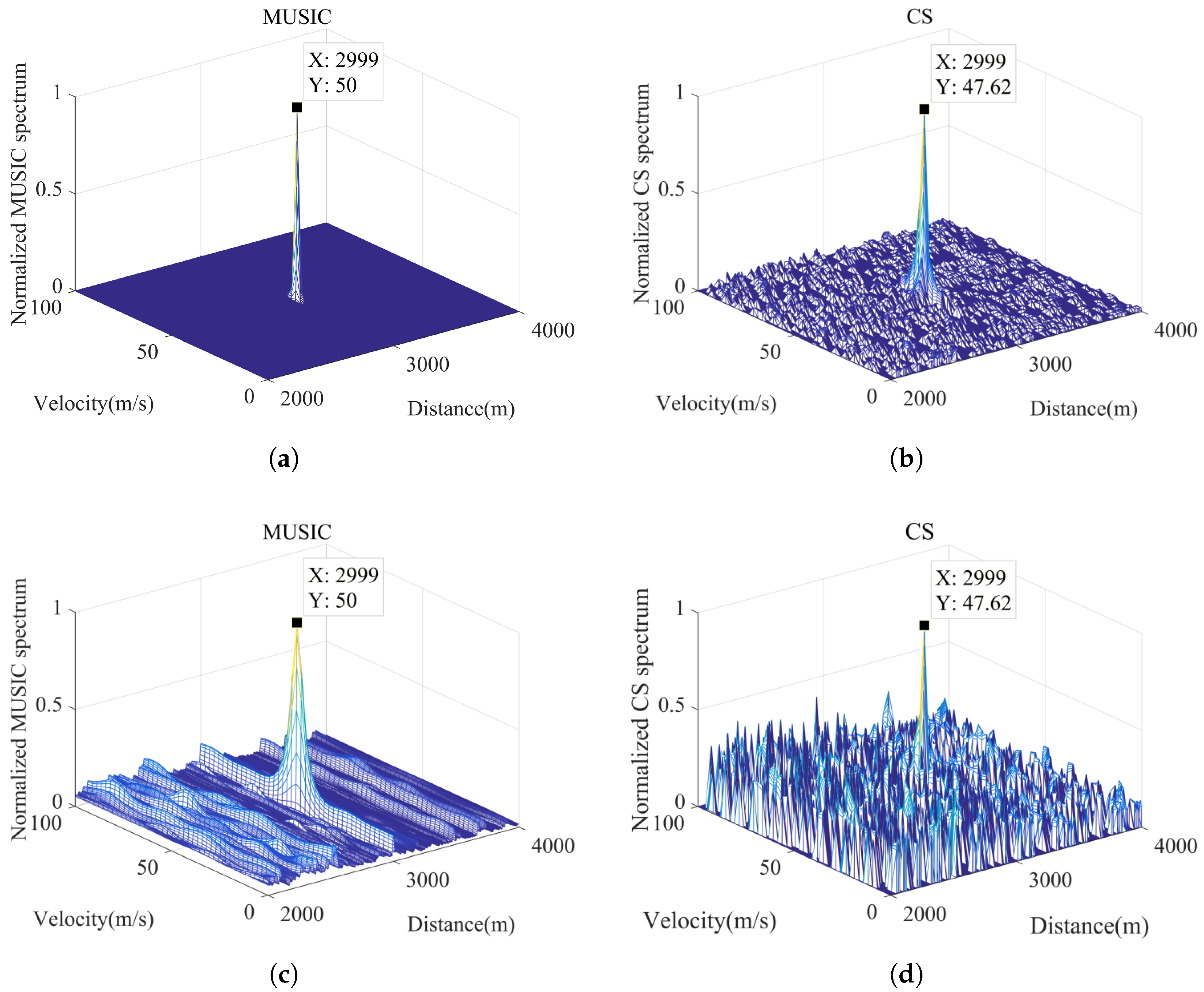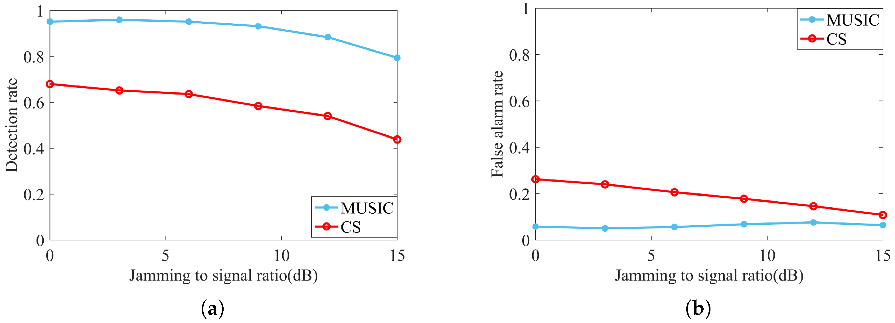 - Compared with traditional Compressive Sensing based methods, the proposed approach demonstrates distinct advantages in jamming suppression, detection accuracy, and computational efficiency. It is particularly robust in high-intensity and dense jamming environments, ensuring stable target information extraction.