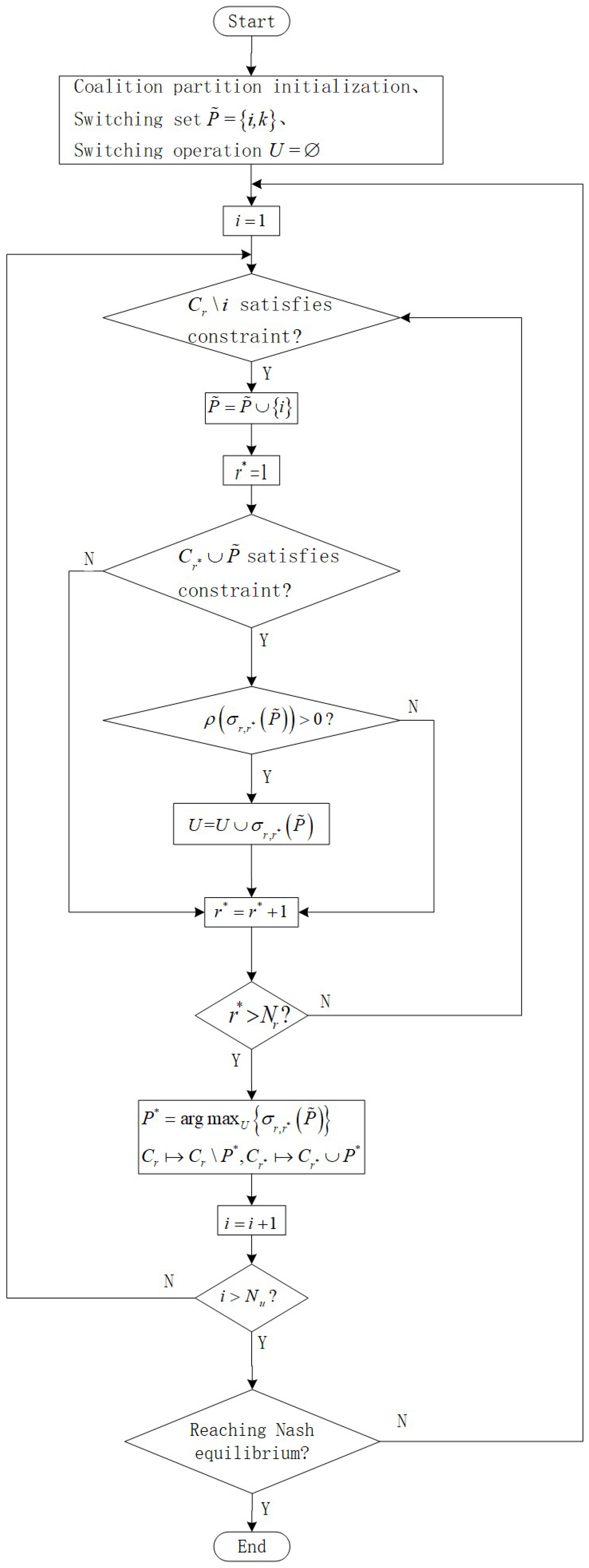 after a limited number of iterations. It can also be inferred that if the algorithm completes at the maximum iteration number, the algorithm becomes trapped at a local optimum during iterative coalition switches and the final result is not a Nash equilibrium. Furthermore, from the flowchart of clustering allocation algorithm in