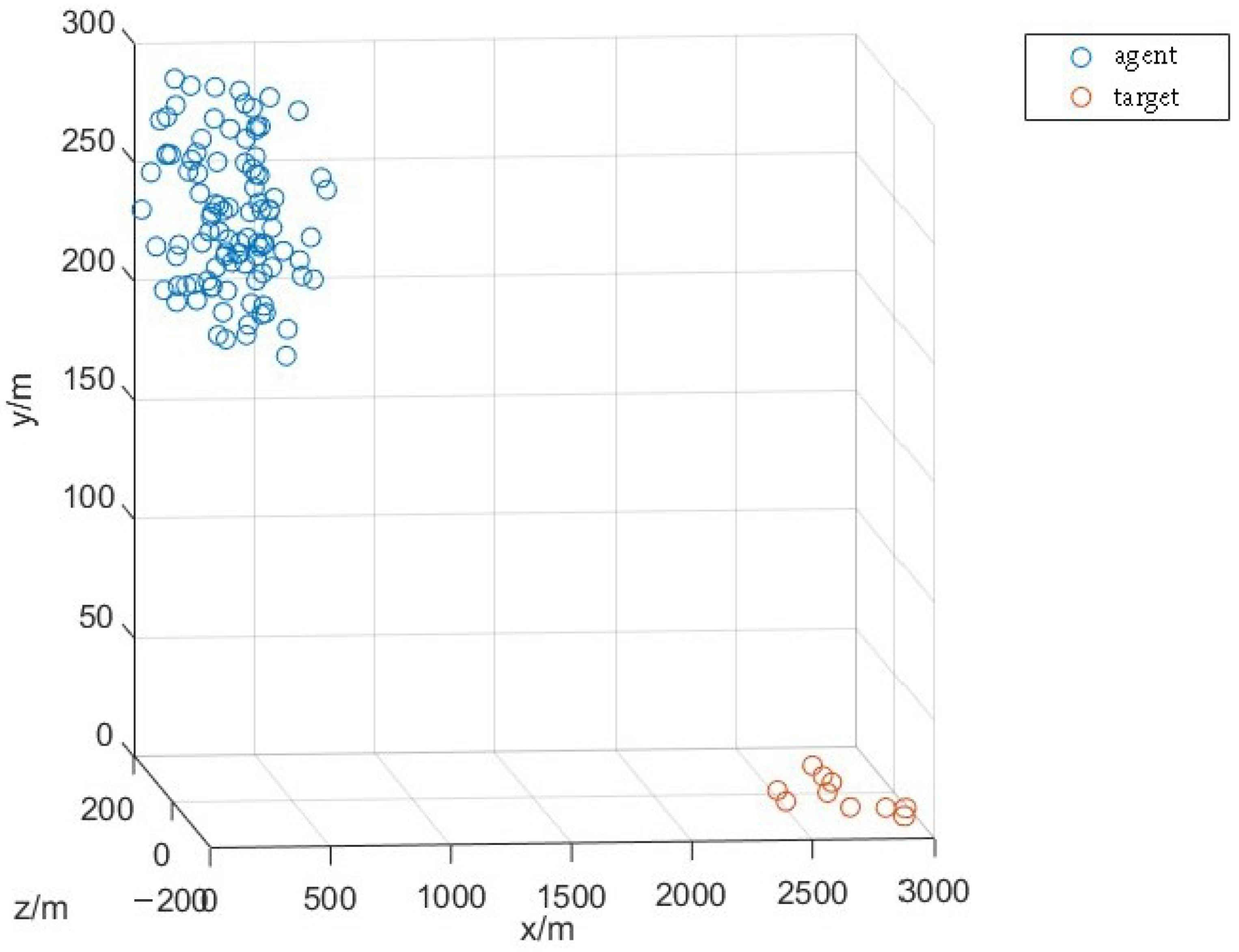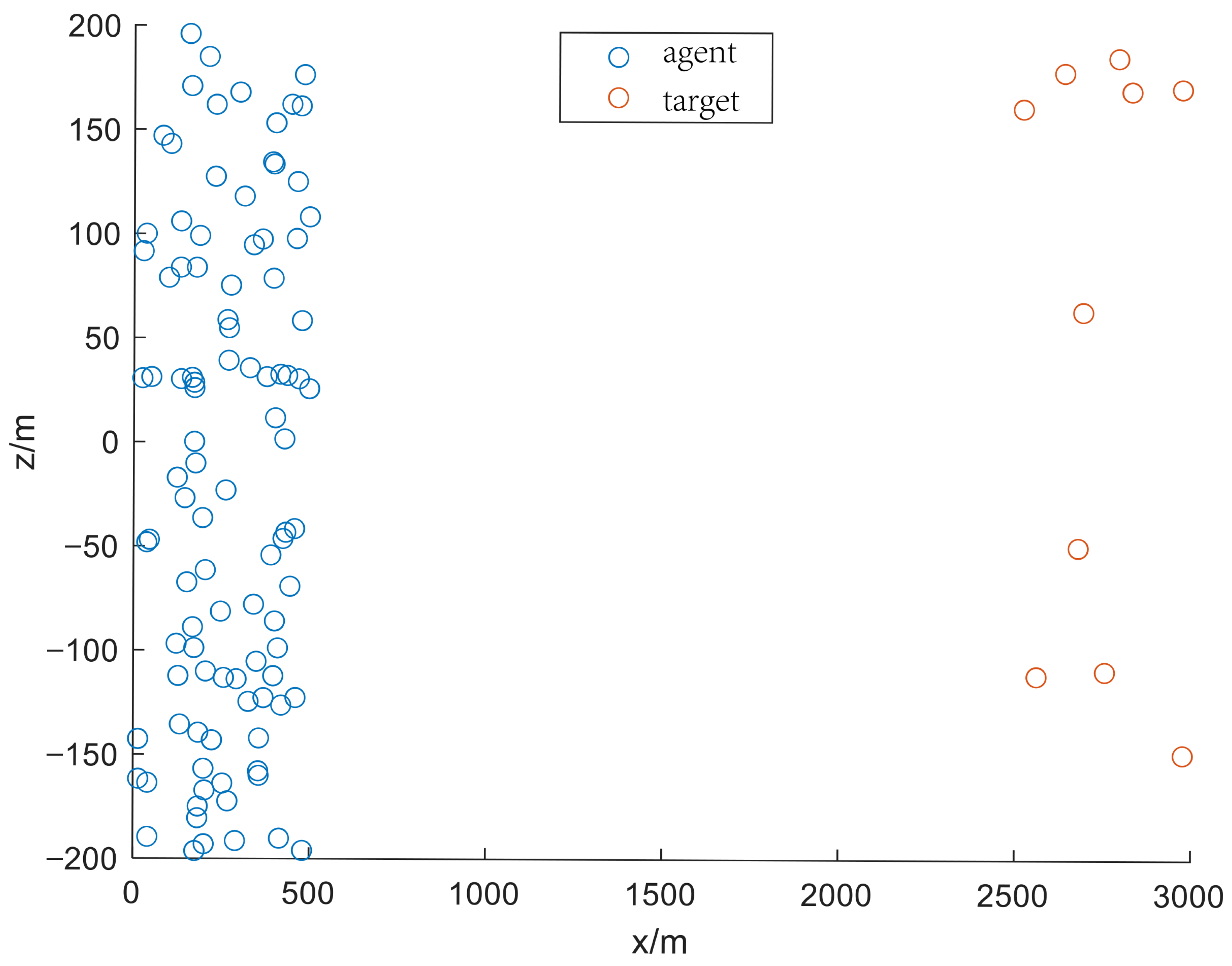 Figure 2, where the height of all agents is 300 m, the speed is 100 m/s, the initial inclination angle and yaw angle are 0°, and the height of all targets is 0 m.