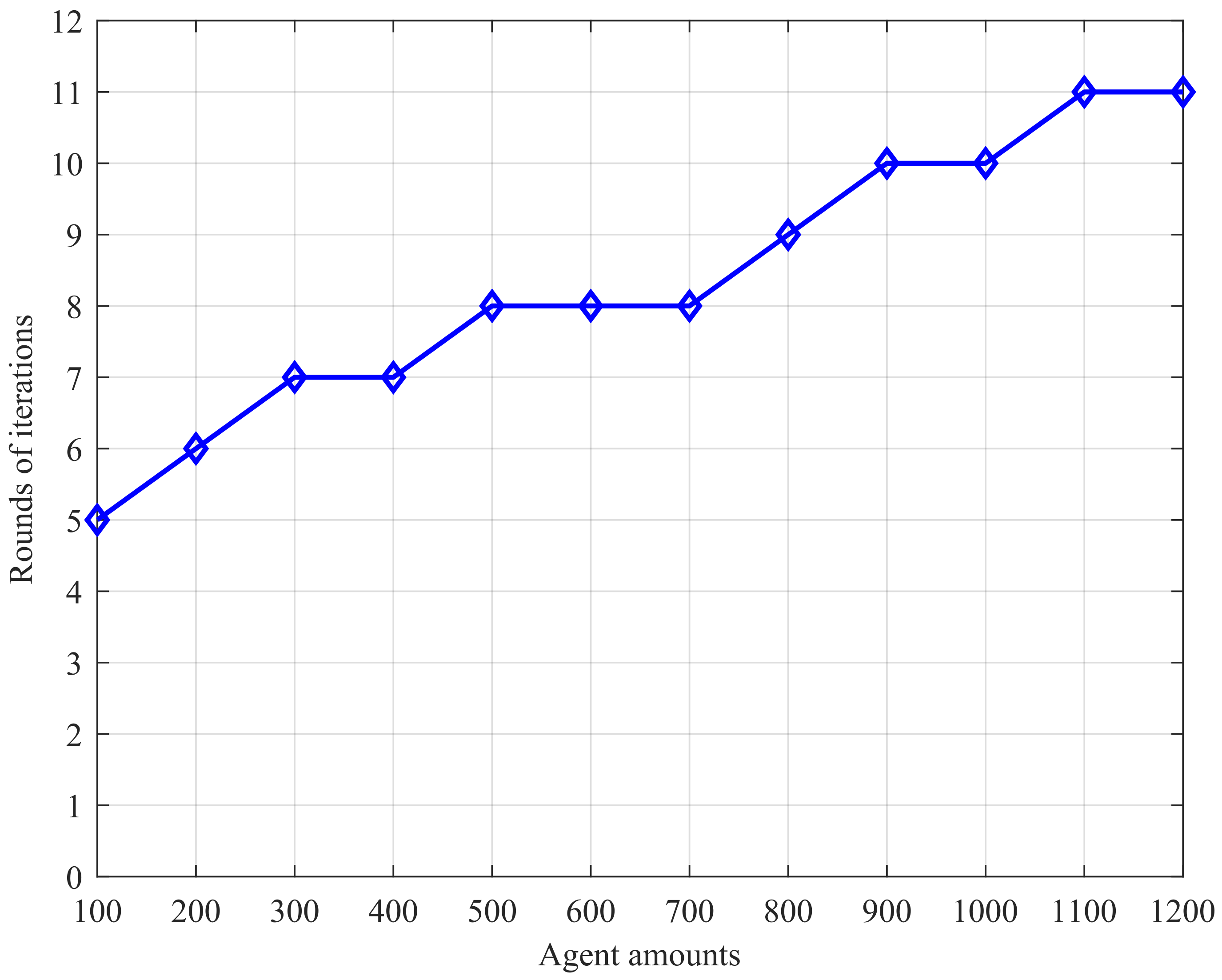 Figure 4, it can also be seen that the round of iterations required for convergence increases slowly as the cluster size expands. This is because as the cluster size increases, the number of switch operations UAV agents can perform increases, requiring more iterations to achieve network stability.