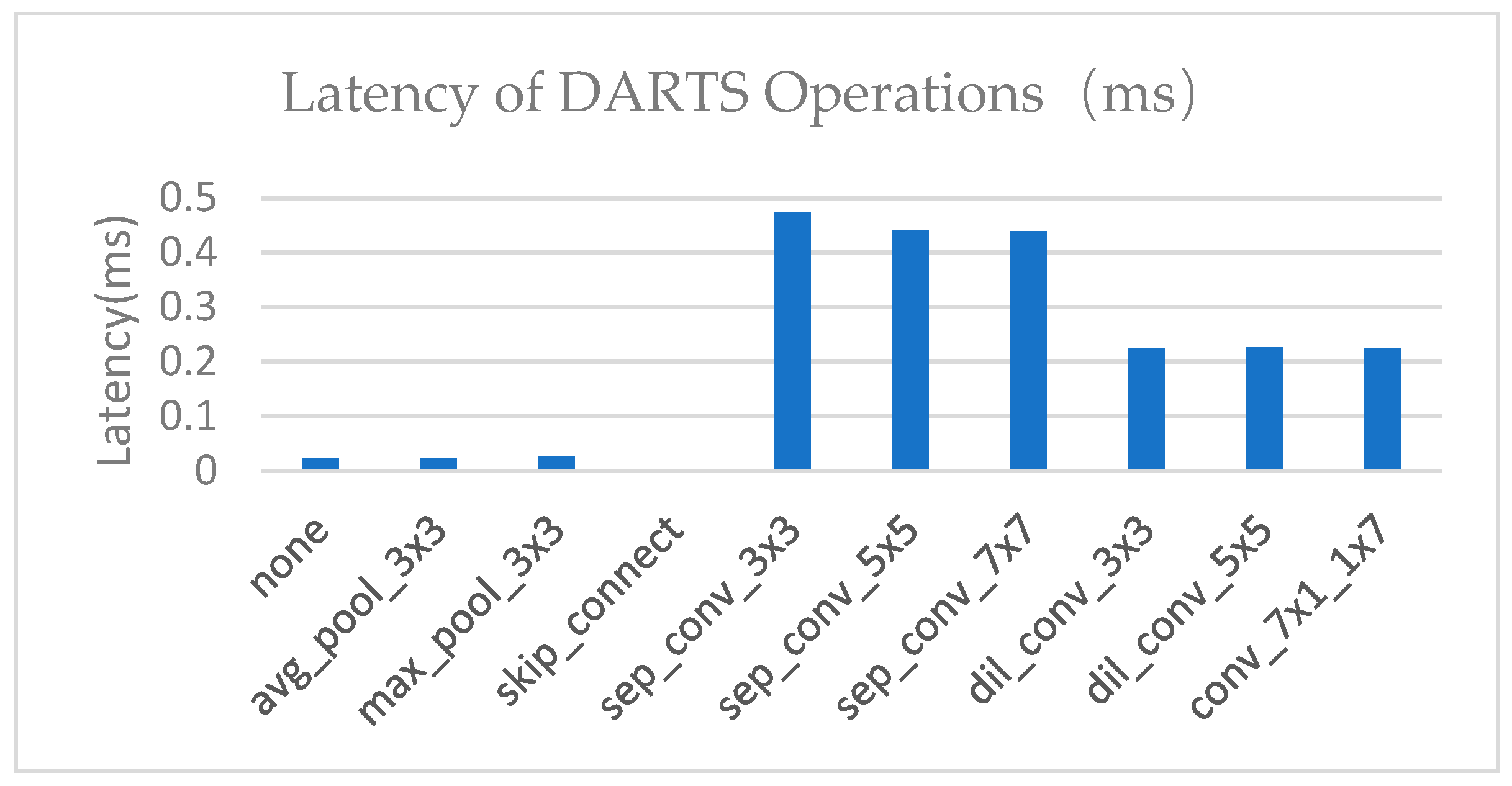 32], a standard benchmark suite in the neural architecture search (NAS) field, also excludes 5 × 5 and 7 × 7 convolutional operations. Therefore, following the design principles adopted in VGG and NAS-Bench-201, we discard the high-FLOP operators used in DARTS. After measuring the latency of each operator on the target platform (as shown in
