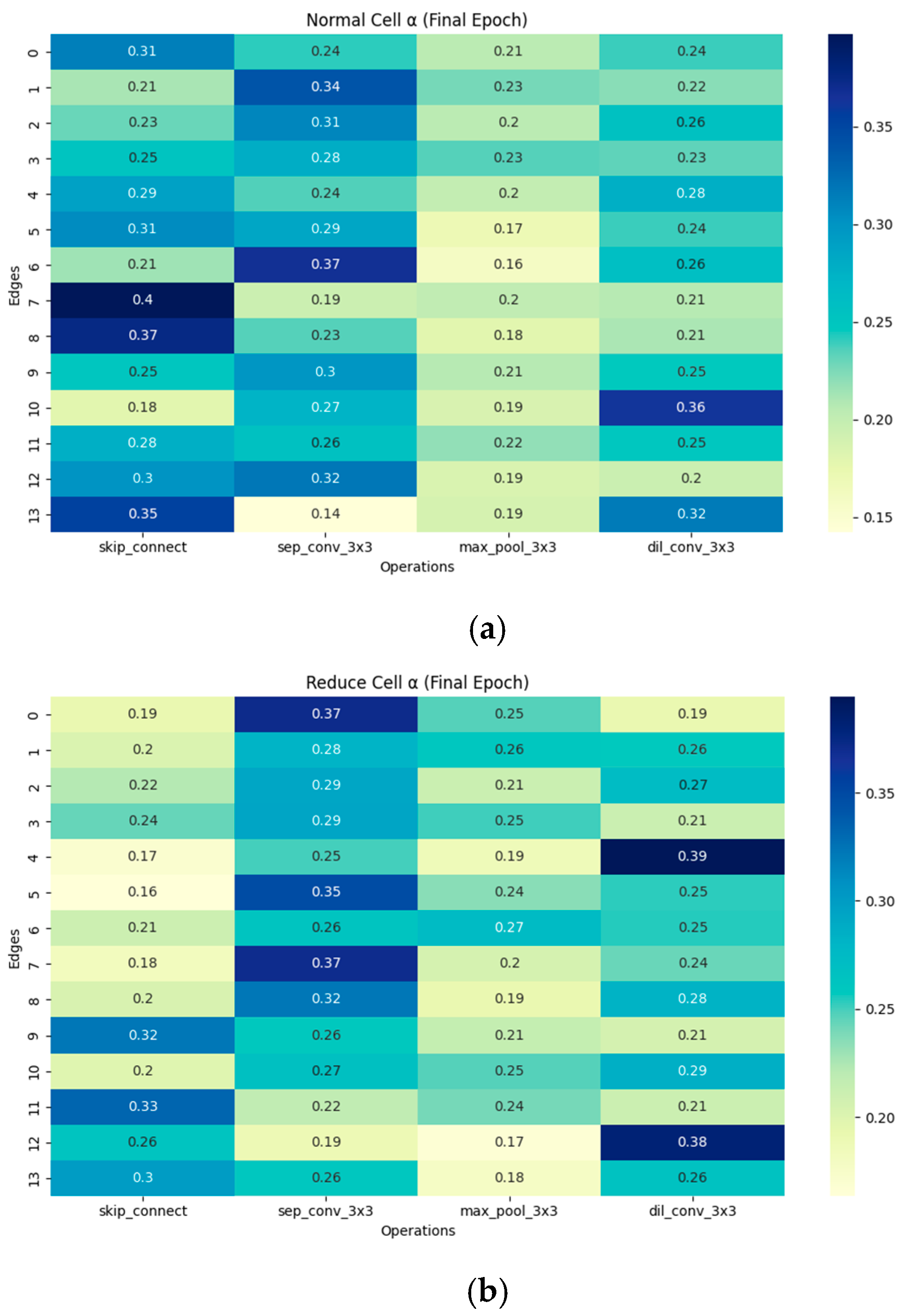Our training configurations largely adhere to the settings established by DARTS. During the architecture search stage, we build a supernet consisting of eight cells (two reduction and six normal cells), where each cell contains = 6 nodes. The search process runs for 50 epochs with an initial channel width of 16. To perform bi-level optimization, we partition the 50,000 CIFAR-10 training images into two equal halves: the first half is utilized to optimize the model weights (w), while the second is reserved for updating the architecture parameters (). We adopt the partial connection strategy, setting the sampling ratio to K = 4, meaning only 1/4 of the operations are sampled for feature transmission on each edge. Due to the high memory consumption of full channel connections, the original DARTS is limited to a batch size of 64. In contrast, our memory-efficient strategy allows us to increase the search phase batch size to 256, which improves the stability of the optimization process. The network weights (w) are optimized using SGD with momentum (0.9), an initial learning rate of 0.1 (annealed to zero using a cosine schedule without restarts), the entropy regularizer is initialized with a coefficient of 0.001, and a weight decay of 3 × 10−4. Benefiting from the increased batch size, the entire search process takes only 1.8 h on a single NVIDIA GTX 1080 Ti GPU for CIFAR-10.