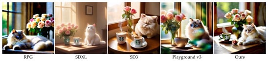 Outputs from different T2I models (RPG, SDXL, SD3, Playgroundv3) generated using the same prompt: “From left to right, bathed in soft morning light, a cozy nook features a steaming Starbucks latte on a rustic table beside an elegant vase of blooming roses, while a plush ragdoll cat purrs contentedly nearby, its eyes half-closed inblissful serenity.”.